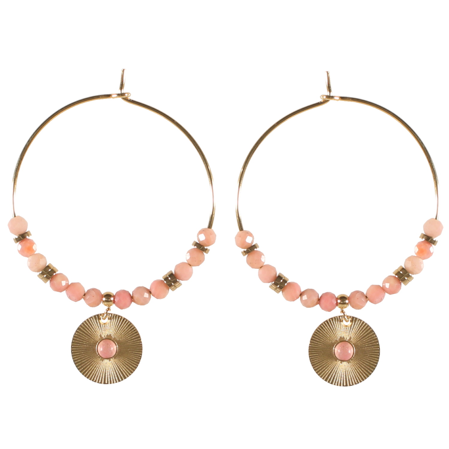 Boucles d'oreilles créoles en acier doré surmontées de perles de couleur en pierre naturelle et perles cylindriques en acier doré et d'un pendant rond aux motifs de rayons en acier doré surmonté d'une pierre naturelle de couleur.