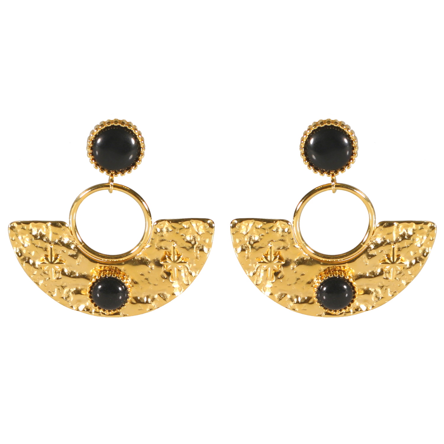 Boucles d'oreilles pendantes composées d'un cercle avec demi pastille martelée et motif d'étoiles en acier 316L doré surmontées de deux pierres serties clos de forme ronde et de couleur noire.