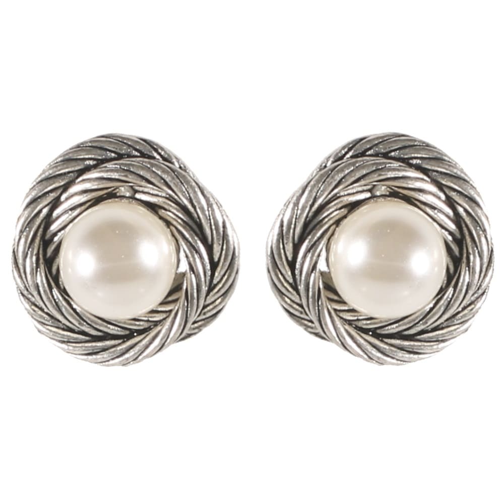 Description Boucles d'oreilles dormeuses avec motif enttrelacé en métal argenté et perles synthétiques. Cliquez sur une matière, un thème, une couleur ou une collection pour voir tous les articles associés.