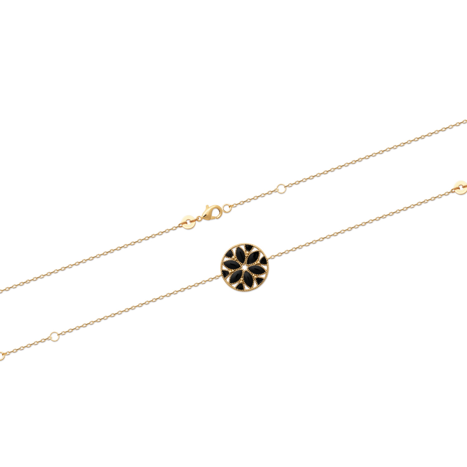Bracelet composé d'une chaîne en plaqué or jaune 18 carats et d'une pastille ronde avec une fleur en émail de couleur noire.