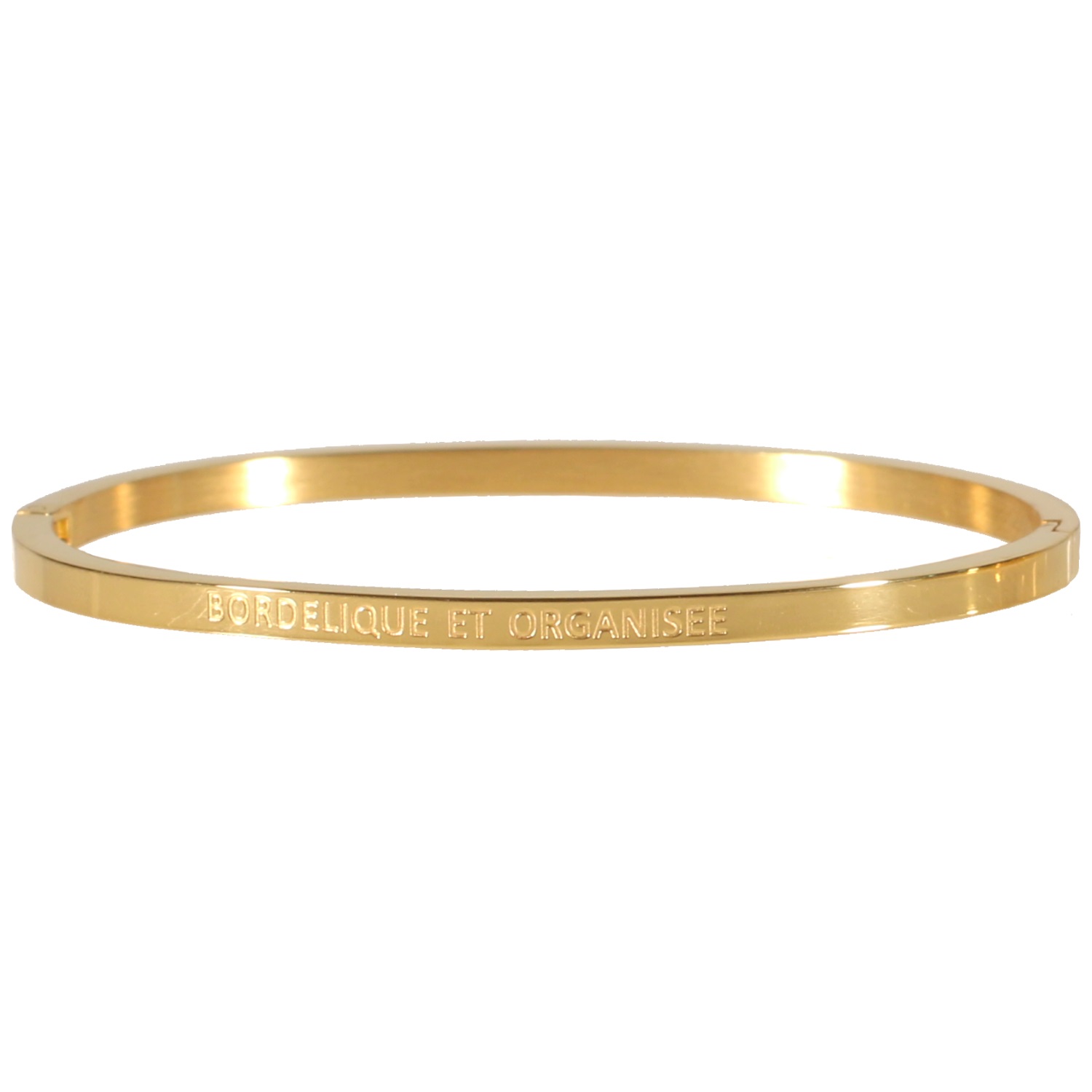 Bracelet jonc rigide en acier doré avec l'inscription BORDELIQUE ET ORGANISEE.