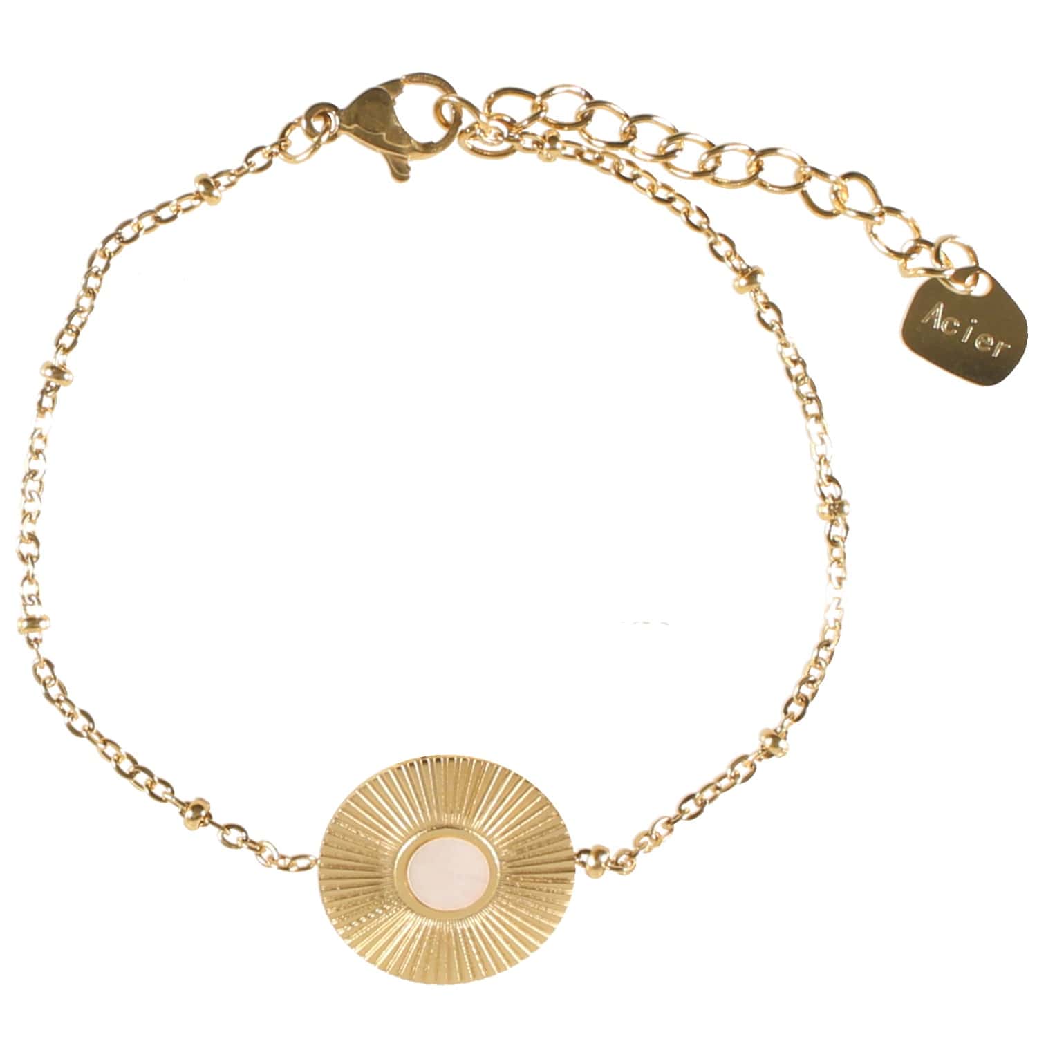 Description Bracelet avec médaille en acier doré et pierre ronde en nacre. Fermoir mousqueton avec rallonge de 3 cm. Longueur 15+3 cm [Guide des tailles] Largeur 16 mm Matière(s) Acier , Nacre . L'acier utilisé dans la bijouterie existe sous plusieurs qualités. Nous utilisons principalement la qualité 316L, qualité qui est utilisée en chirurgie. Cet acier est donc inoxydable et reste très résistant. Fermoir Mousqueton Couleur(s) dominante(s) Doré Public Adolescent , Adulte . Genre Femme , Fille . Saison Indémodable . Cliquez sur une matière, un thème, une couleur ou une collection pour voir tous les articles associés.