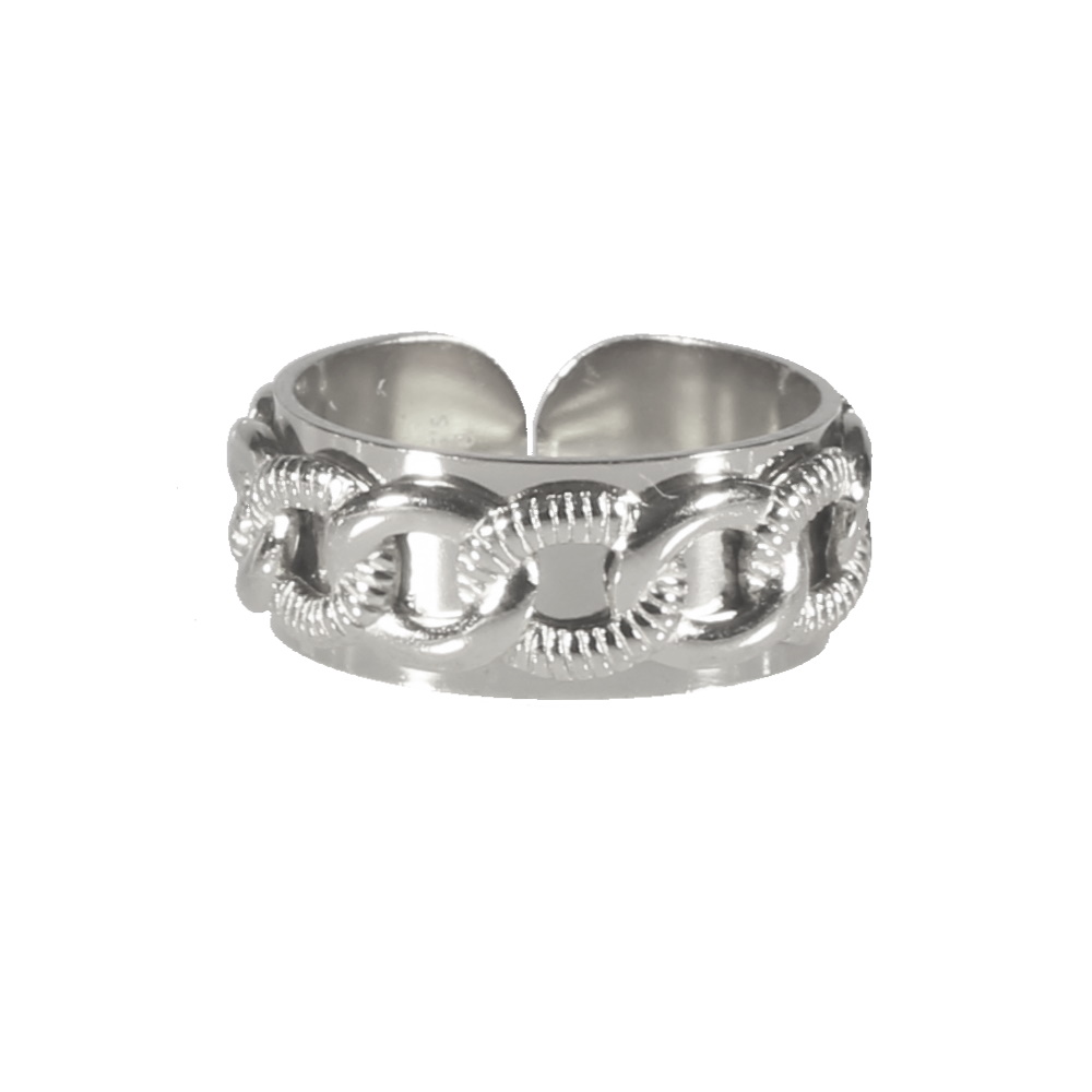 Description Bague anneau surmonté d'une chaîne en acier argenté. Taille ajustable. Largeur 8 mm Matière(s) Acier . L'acier utilisé dans la bijouterie existe sous plusieurs qualités. Nous utilisons principalement la qualité 316L, qualité qui est utilisée en chirurgie. Cet acier est donc inoxydable et reste très résistant. Fermoir Aucun Couleur(s) dominante(s) Argenté Public Adolescent , Adulte . Genre Femme , Fille . Saison Indémodable . Cliquez sur une matière, un thème, une couleur ou une collection pour voir tous les articles associés.