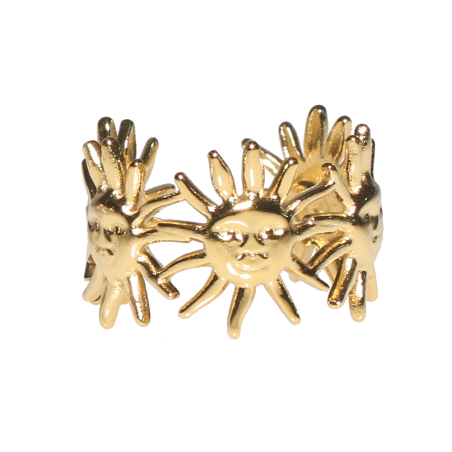 Bague en forme de soleils avec visage en acier doré.