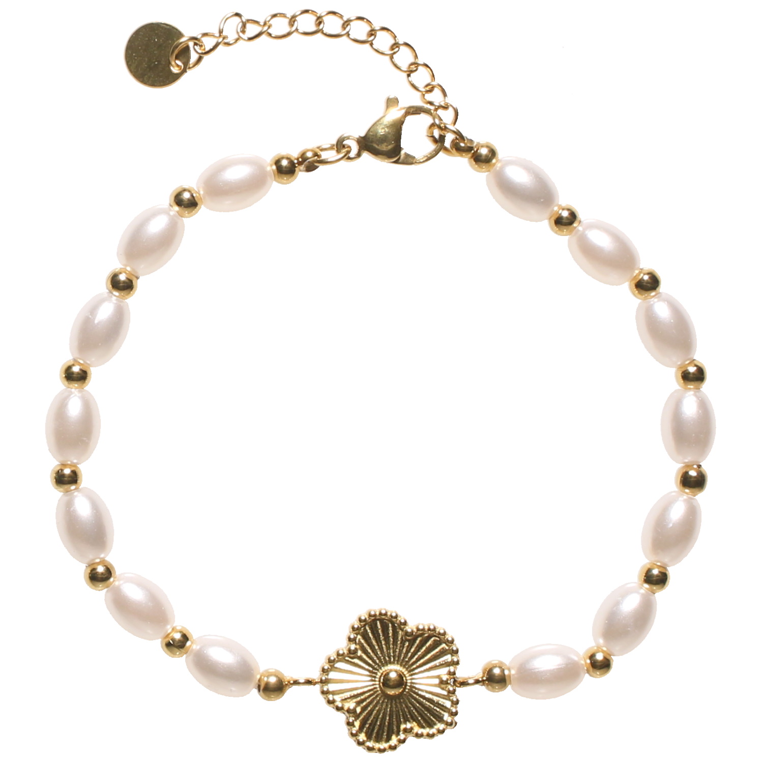 Description Bracelet composé d'une chaîne avec perles et une fleur en acier doré et de perles d'imitation. Fermoir mousqueton avec 3 cm de rallonge. Cliquez sur une matière, un thème, une couleur ou une collection pour voir tous les articles associés.