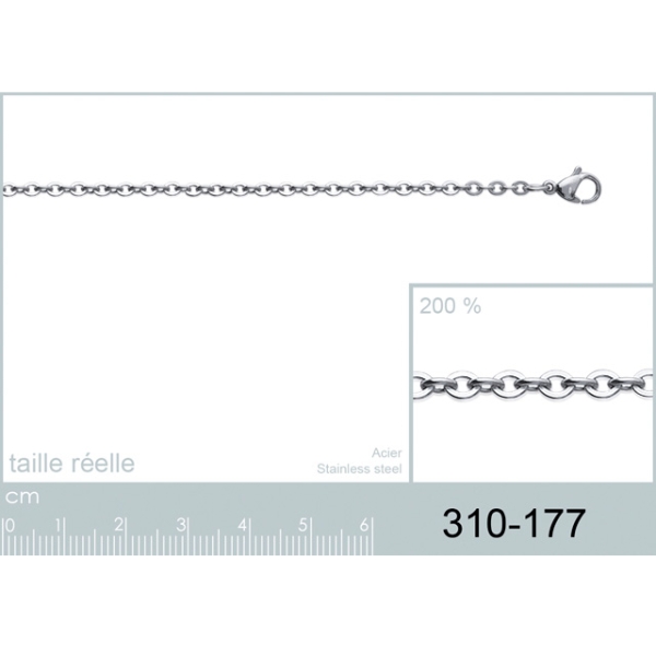 Description Chaîne en acier. Maille forçat. Longueur 50 cm [Guide des tailles] Largeur 2 mm Maille Forçat Matière(s) Acier . L'acier utilisé dans la bijouterie existe sous plusieurs qualités. Nous utilisons principalement la qualité 316L, qualité qui est utilisée en chirurgie. Cet acier est donc inoxydable et reste très résistant. Fermoir Mousqueton À noter Longueur 50 cm Couleur(s) dominante(s) Argenté Public Adulte . Genre Femme , Homme , Mixte . Saison Indémodable . Cliquez sur une matière, un thème, une couleur ou une collection pour voir tous les articles associés.