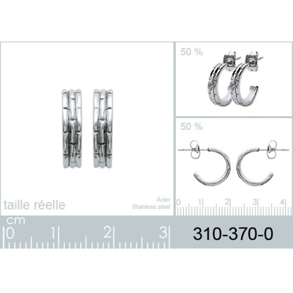 Description Boucles d'oreilles en acier. Largeur 3 mm Diamètre 12 mm [Guide des tailles] Matière(s) Acier . L'acier utilisé dans la bijouterie existe sous plusieurs qualités. Nous utilisons principalement la qualité 316L, qualité qui est utilisée en chirurgie. Cet acier est donc inoxydable et reste très résistant. Fermoir Tiges poussettes Couleur(s) dominante(s) Argenté Public Adulte . Genre Femme . Saison Indémodable . Collection Pêlemêle Cliquez sur une matière, un thème, une couleur ou une collection pour voir tous les articles associés.
