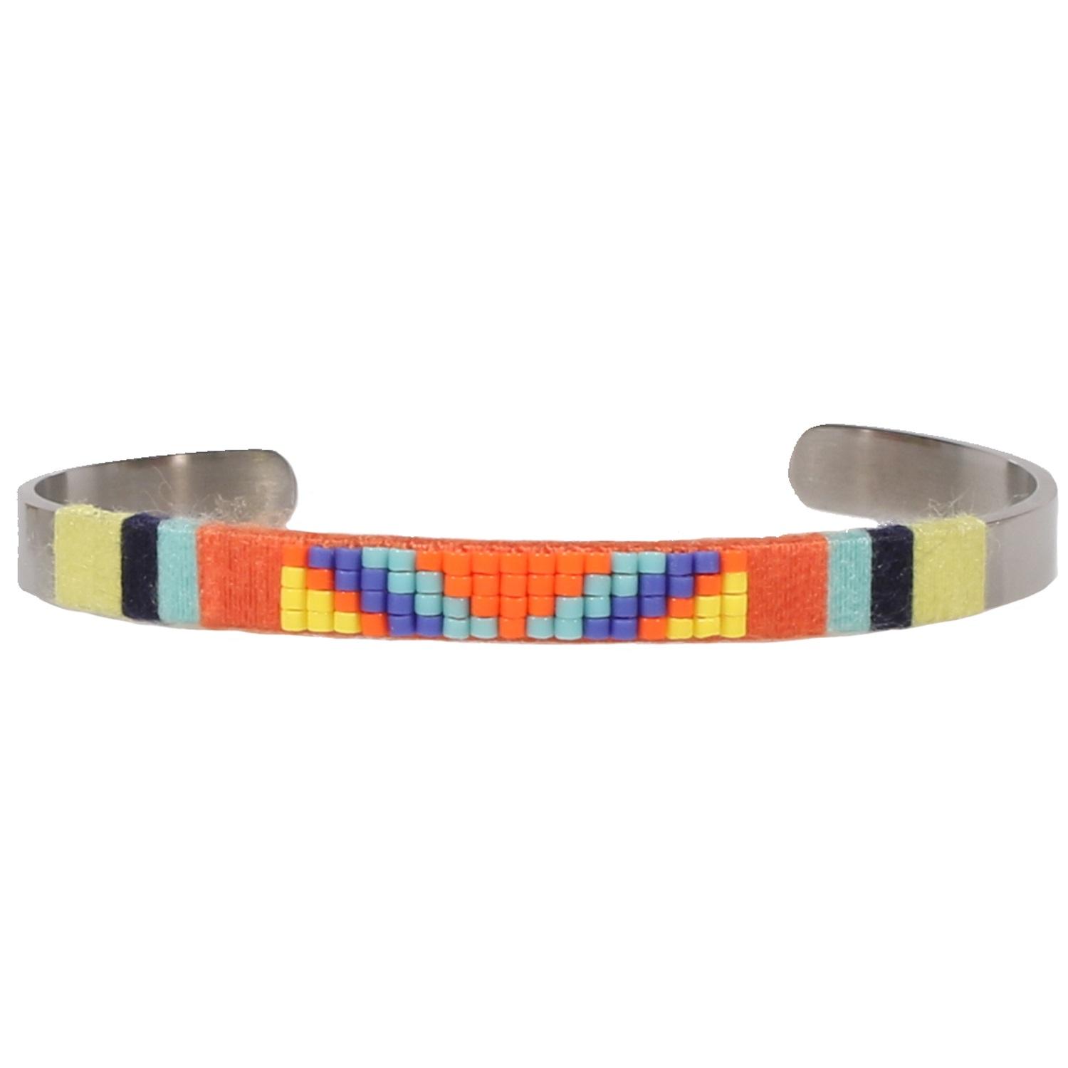 Bracelet jonc rigide en acier argenté, rocaille et textile.