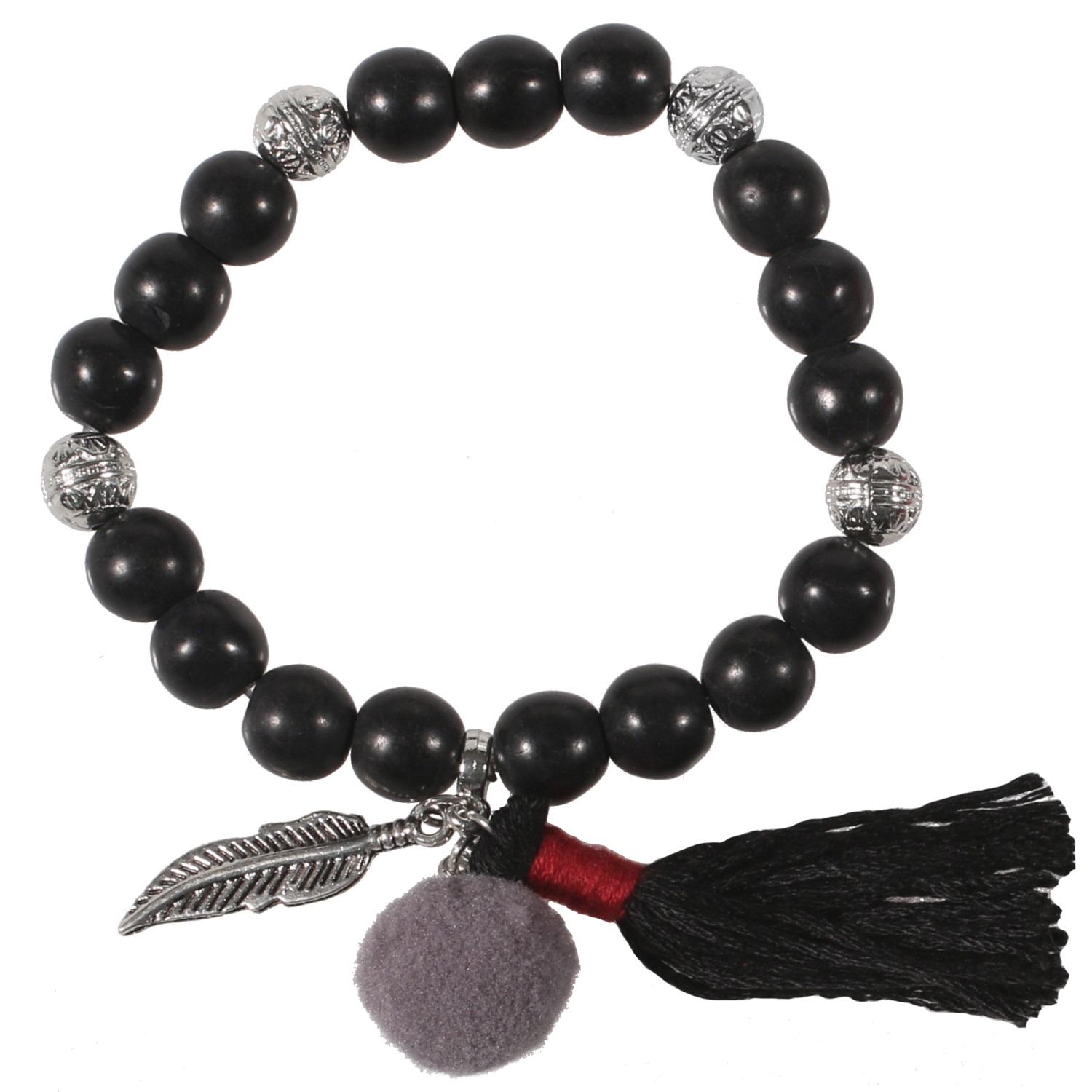 Bracelet fantaisie en métal argenté, rocaille et textile. Elastique Perle Plume Pompon  Adolescent Adulte Femme Fille Hiver