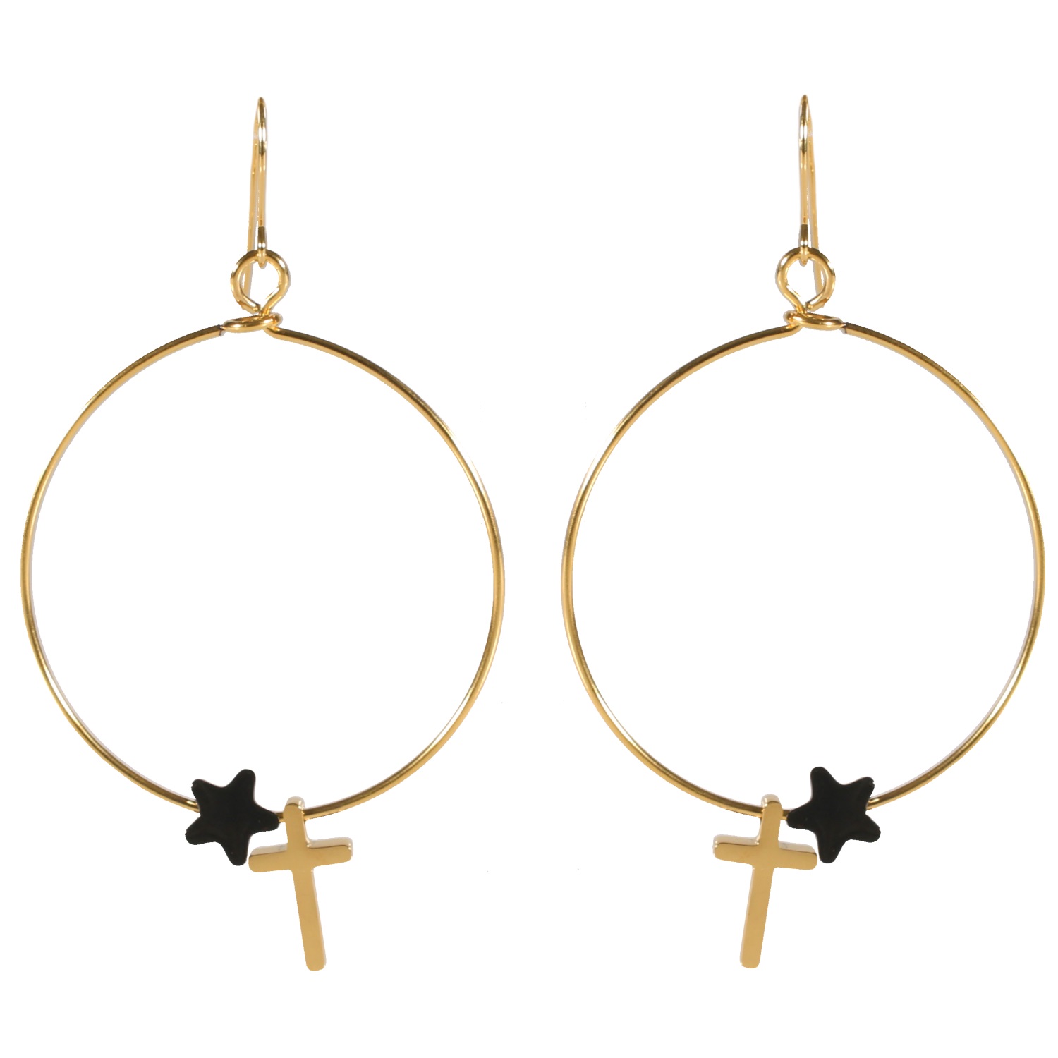Description Boucles d'oreilles pendantes cercle avec croix pendante en acier doré et étoile en acier noir. Largeur 40 mm Hauteur 75 mm Matière(s) Acier . L'acier utilisé dans la bijouterie existe sous plusieurs qualités. Nous utilisons principalement la qualité 316L, qualité qui est utilisée en chirurgie. Cet acier est donc inoxydable et reste très résistant. Fermoir Crochets Couleur(s) dominante(s) Doré Public Adolescent , Adulte . Genre Femme , Fille . Saison Indémodable . Thème(s) Religion , Symboles . Cliquez sur une matière, un thème, une couleur ou une collection pour voir tous les articles associés.