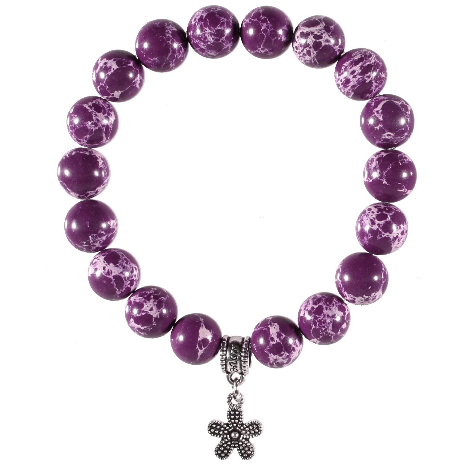 Bracelet élastique avec fleur en métal argenté et boules en pierre sugilite.