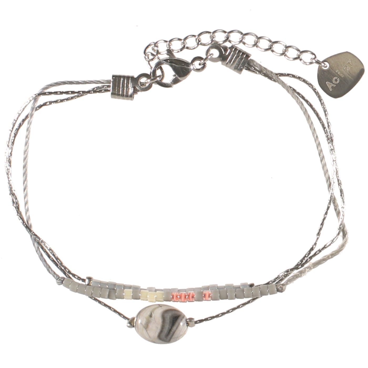 Bracelet triple rangs composé d'un cordon en textile avec perles de couleur, un cordon en acier argenté avec perles de couleur ainsi qu'un cordon en acier argenté et une pierre de couleur.