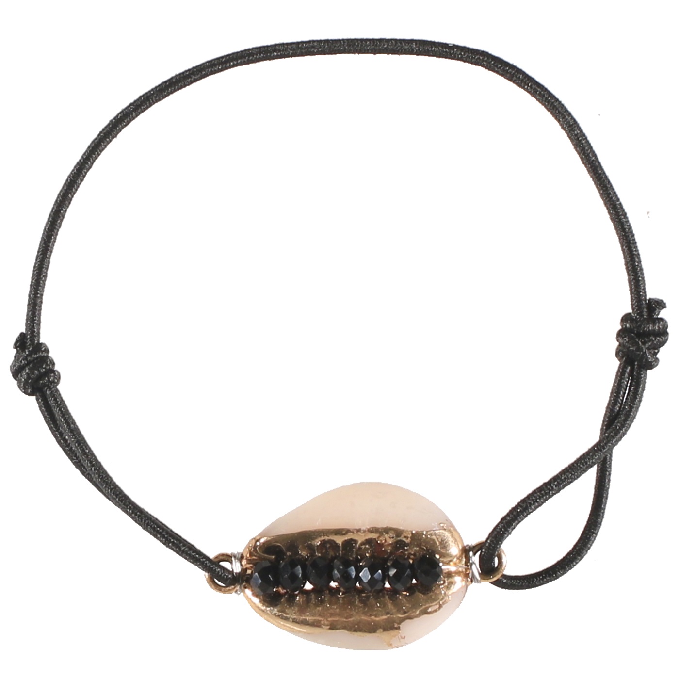 Bracelet avec cordon élastique en coton et un véritable coquillage cauri avec dorure en acier doré et incrusté de pierres de couleur.