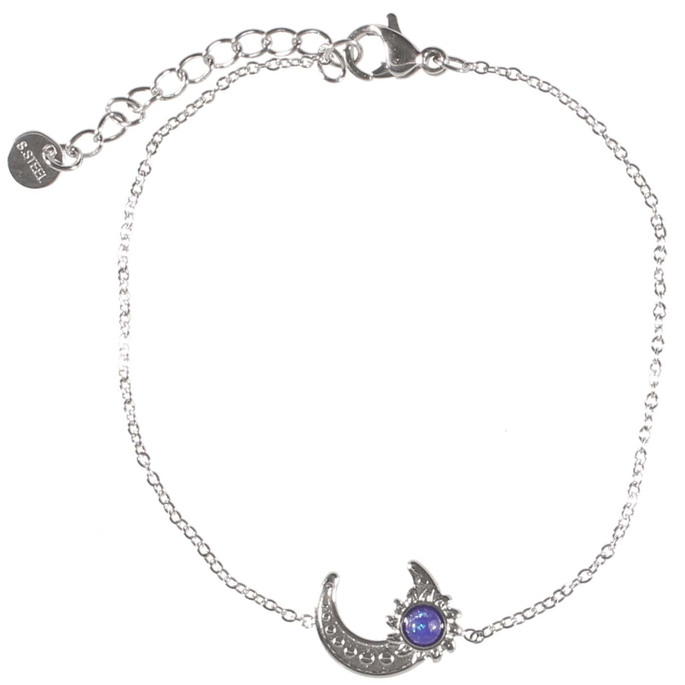 Description Bracelet avec croissant de lune en acier argenté et pierre synthétique de couleur bleue. Fermoir mousqueton avec rallonge de 3 cm. Cliquez sur une matière, un thème, une couleur ou une collection pour voir tous les articles associés.