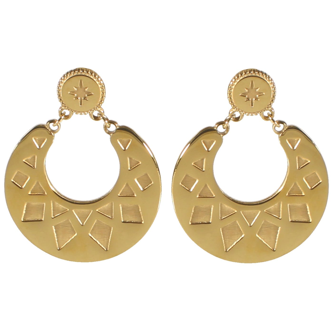 Description Boucles d'oreilles pendantes avec motifs gravés (étoiles, triangles, losanges...) en acier doré. Largeur 25 mm Hauteur 32 mm Matière(s) Acier . L'acier utilisé dans la bijouterie existe sous plusieurs qualités. Nous utilisons principalement la qualité 316L, qualité qui est utilisée en chirurgie. Cet acier est donc inoxydable et reste très résistant. Fermoir Tiges poussettes Couleur(s) dominante(s) Doré Public Adolescent , Adulte . Genre Femme , Fille . Saison Indémodable . Thème(s) Nature . Cliquez sur une matière, un thème, une couleur ou une collection pour voir tous les articles associés.