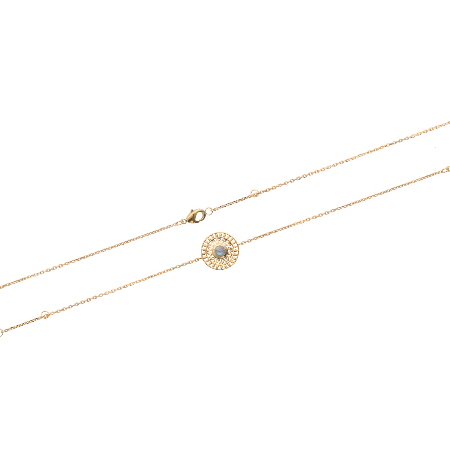 Description Bracelet composé une pastille aux motifs ajourés surmontée d'une véritable pierre de labradorite montée sur une chaîne en plaqué or 18 carats. Fermoir mousqueton avec anneaux de rappel à 16 et 18 cm. Longueur 16/18 cm [Guide des tailles] Largeur 14 mm Matière(s) Labradorite , Pierre naturelle , Plaqué or . Nos bijoux en plaqué or sont faits sur une base de laiton et recouverts d'or 18 carats à 3 microns sans dispersion. Cela signifie que nous garantissons 3 microns d'or sur n'importe quelle partie du bijou. Sur la plupart de nos bijoux empierrés, nous montons à 5 microns d'or 18 carats. Pour finir, nous faisons également une finition avec de l'or 24 carats afin de donner un plus bel éclat à nos bijoux. Fermoir Mousqueton Couleur(s) dominante(s) Doré Public Adolescent , Adulte . Genre Femme , Fille . Saison Indémodable . Collection Royale inca Cliquez sur une matière, un thème, une couleur ou une collection pour voir tous les articles associés.