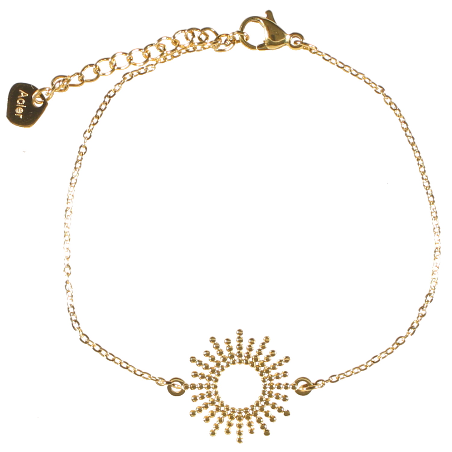 Description Bracelet composé d'une chaîne et d'un cercle avec rayons de soleil en acier doré. Fermoir mousqueton avec rallonge de 3 cm. Longueur 16+3 cm [Guide des tailles] Largeur 15 mm Matière(s) Acier . L'acier utilisé dans la bijouterie existe sous plusieurs qualités. Nous utilisons principalement la qualité 316L, qualité qui est utilisée en chirurgie. Cet acier est donc inoxydable et reste très résistant. Fermoir Mousqueton Couleur(s) dominante(s) Doré Public Adolescent , Adulte . Genre Femme , Fille . Saison Indémodable . Thème(s) Nature . Collection My Sun Cliquez sur une matière, un thème, une couleur ou une collection pour voir tous les articles associés.