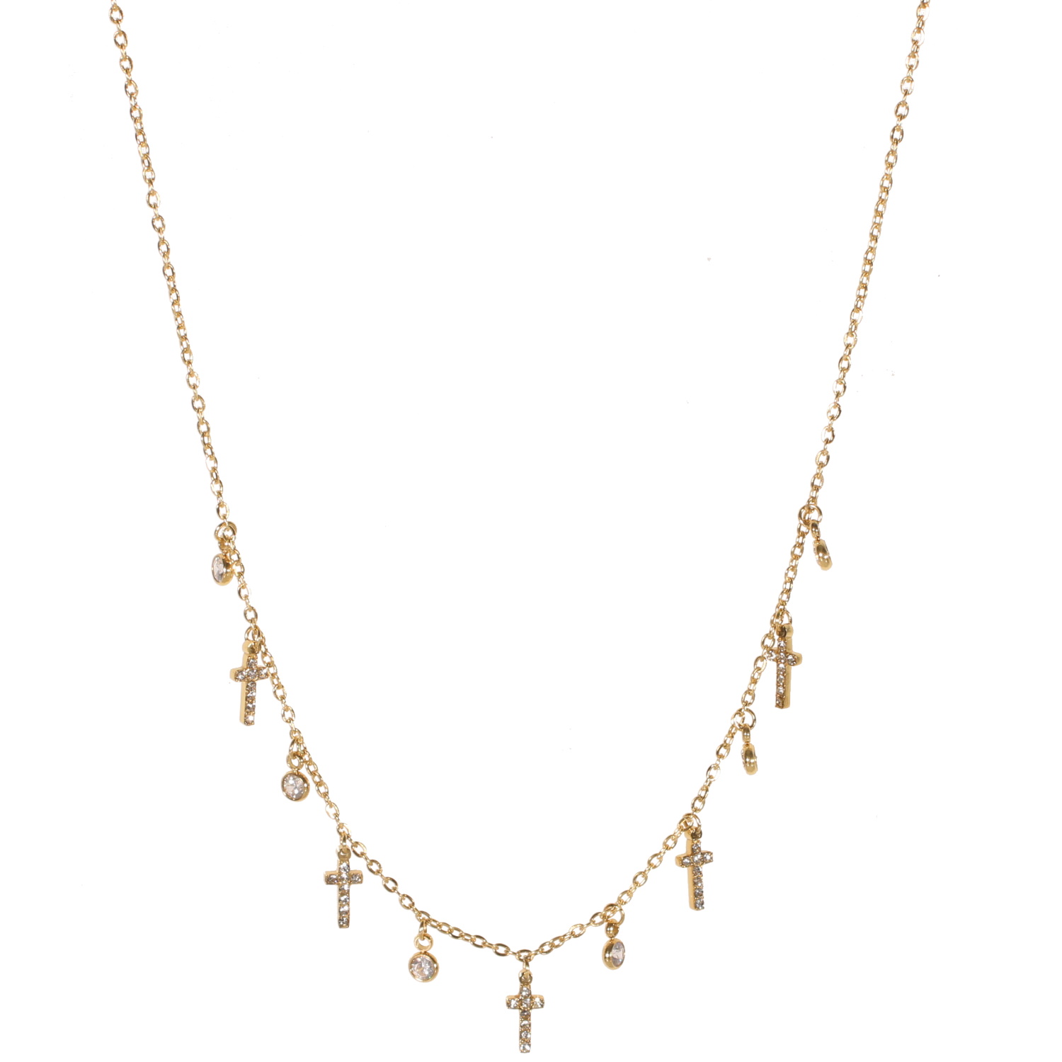 Collier composé d'une chaîne en acier doré avec pampilles au motif de croix pavées de strass et pampilles de cristaux sertis clos.<br/>Fermoir mousqueton avec 5 cm de rallonge. Croix Rond Strass  Adolescent Adulte Femme Fille Indémodable Religion Symboles Collier composé d'une chaîne en acier doré avec pampilles au motif de croix pavées de strass et pampilles de cristaux sertis clos.<br/>Fermoir mousqueton avec 5 cm de rallonge. Croix Rond Strass  Adolescent Adulte Femme Fille Indémodable Religion Symboles