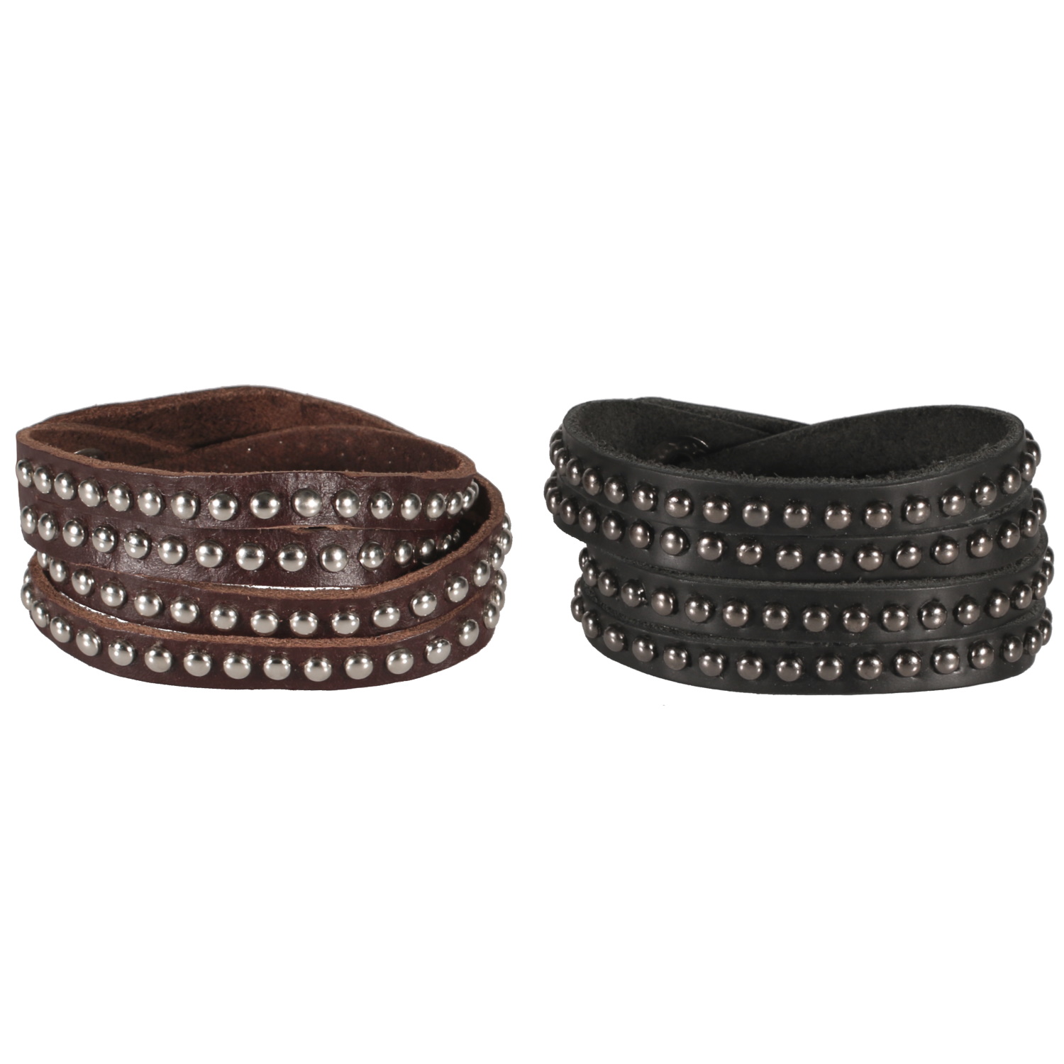 Bracelet double tours et double rangs en cuir clouté de forme ronde en métal argenté.