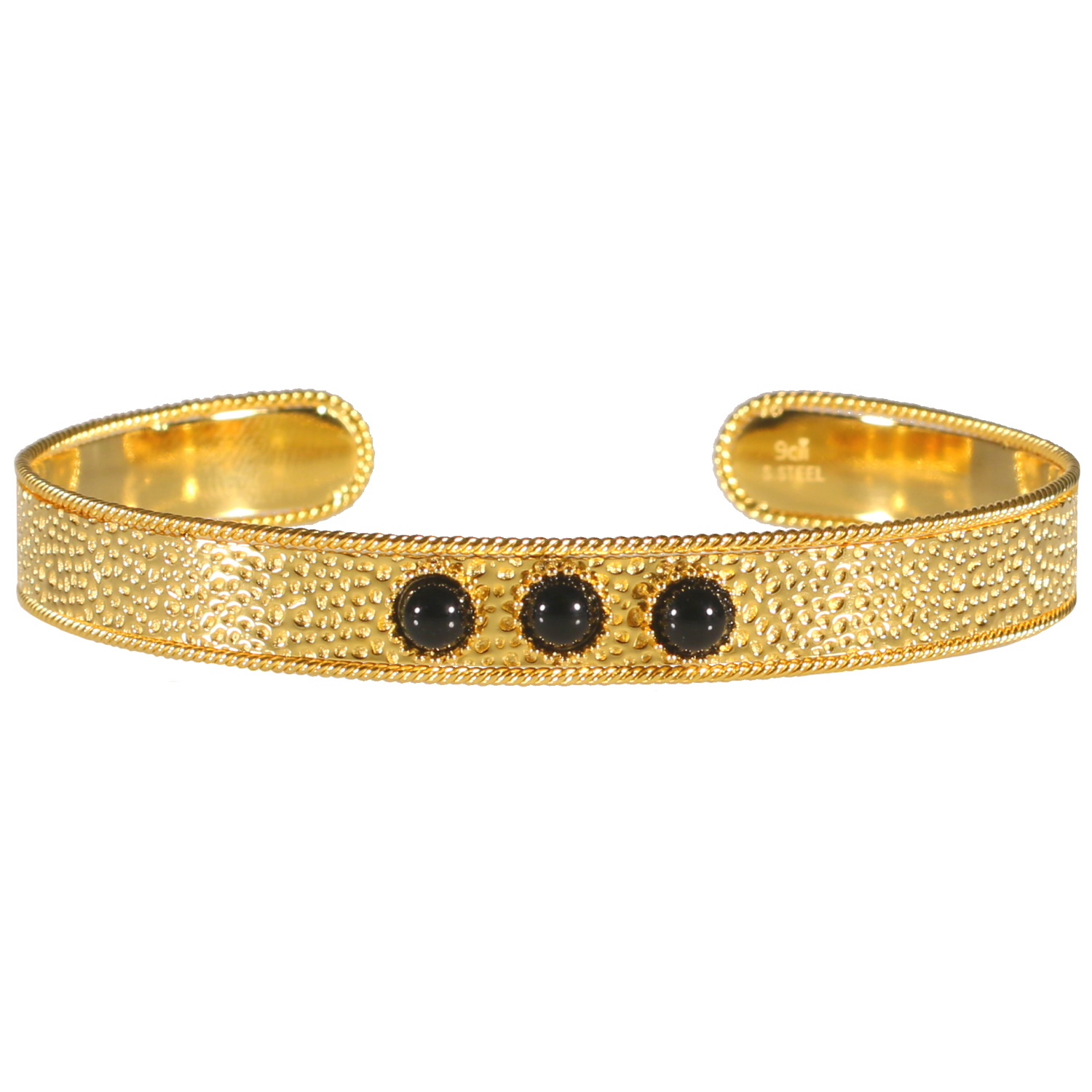 Description Bracelet jonc ouvert et rigide aux motifs martelés en acier 316L doré surmonté de trois pierres de couleur noire serties clos de forme ronde. Largeur 8 mm Diamètre 60 mm [Guide des tailles] Matière(s) Acier , Rocaille . L'acier utilisé dans la bijouterie existe sous plusieurs qualités. Nous utilisons principalement la qualité 316L, qualité qui est utilisée en chirurgie. Cet acier est donc inoxydable et reste très résistant. Fermoir Aucun Couleur(s) dominante(s) Doré , Noir Public Adolescent , Adulte . Genre Femme , Fille . Saison Indémodable . Cliquez sur une matière, un thème, une couleur ou une collection pour voir tous les articles associés.