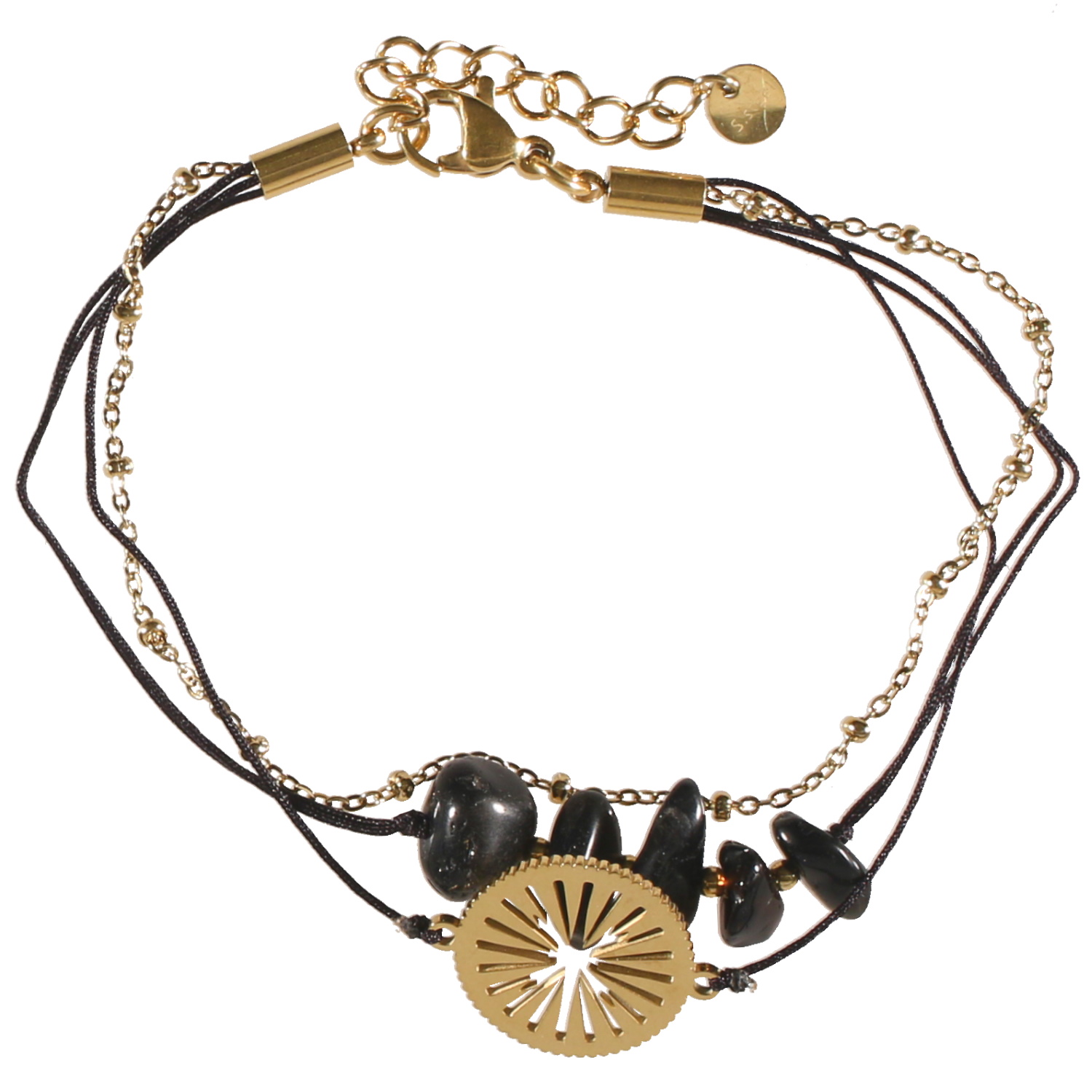 Bracelet triple rangs composé d'une chaîne en acier doré, un cordon en coton et d'une pastille ronde au motif ajouré en acier doré, ainsi qu'un cordon en coton avec 5 pierres de couleur noire.