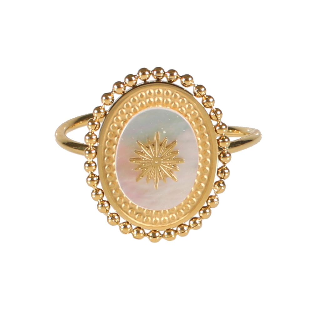Bague avec pastille ovale en acier doré pavée de nacre surmonté d'une étoile en acier doré.