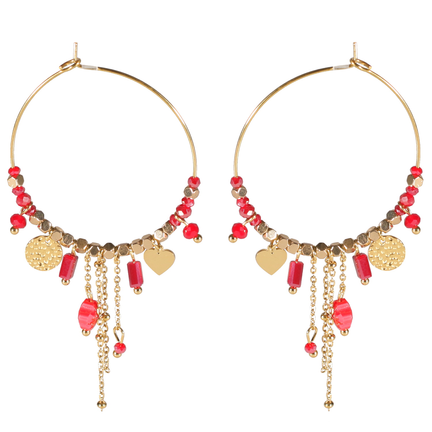 Description Boucles d'oreilles créoles avec pendants (chaînettes, cœur, pastille ronde martelée) et perles cubiques en acier 316L doré et perles de couleur rouge. Hauteur 70 mm Diamètre 35 mm Matière(s) Acier , Rocaille . L'acier utilisé dans la bijouterie existe sous plusieurs qualités. Nous utilisons principalement la qualité 316L, qualité qui est utilisée en chirurgie. Cet acier est donc inoxydable et reste très résistant. Fermoir Autre Couleur(s) dominante(s) Doré , Rouge Public Adolescent , Adulte . Genre Femme , Fille . Saison Indémodable . Thème(s) Amour . Cliquez sur une matière, un thème, une couleur ou une collection pour voir tous les articles associés.
