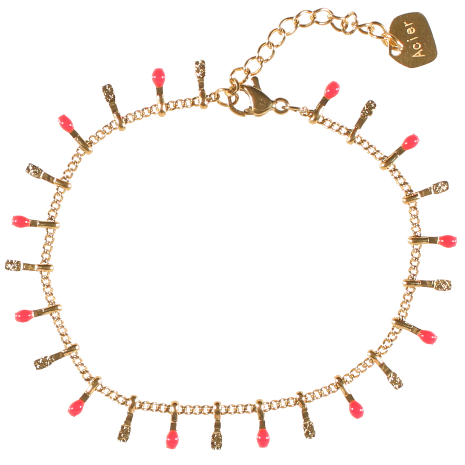 Description Bracelet composé d'une chaîne et de pampilles en acier doré et pampilles pavées d'émail de couleur rose orangé. Fermoir mousqueton avec 3 cm de rallonge. Longueur 15.5+3 cm [Guide des tailles] Largeur 7 mm Matière(s) Acier , Email . L'acier utilisé dans la bijouterie existe sous plusieurs qualités. Nous utilisons principalement la qualité 316L, qualité qui est utilisée en chirurgie. Cet acier est donc inoxydable et reste très résistant. Fermoir Mousqueton Couleur(s) dominante(s) Doré , Rose Public Adolescent , Adulte . Genre Femme , Fille . Saison Indémodable . Cliquez sur une matière, un thème, une couleur ou une collection pour voir tous les articles associés.