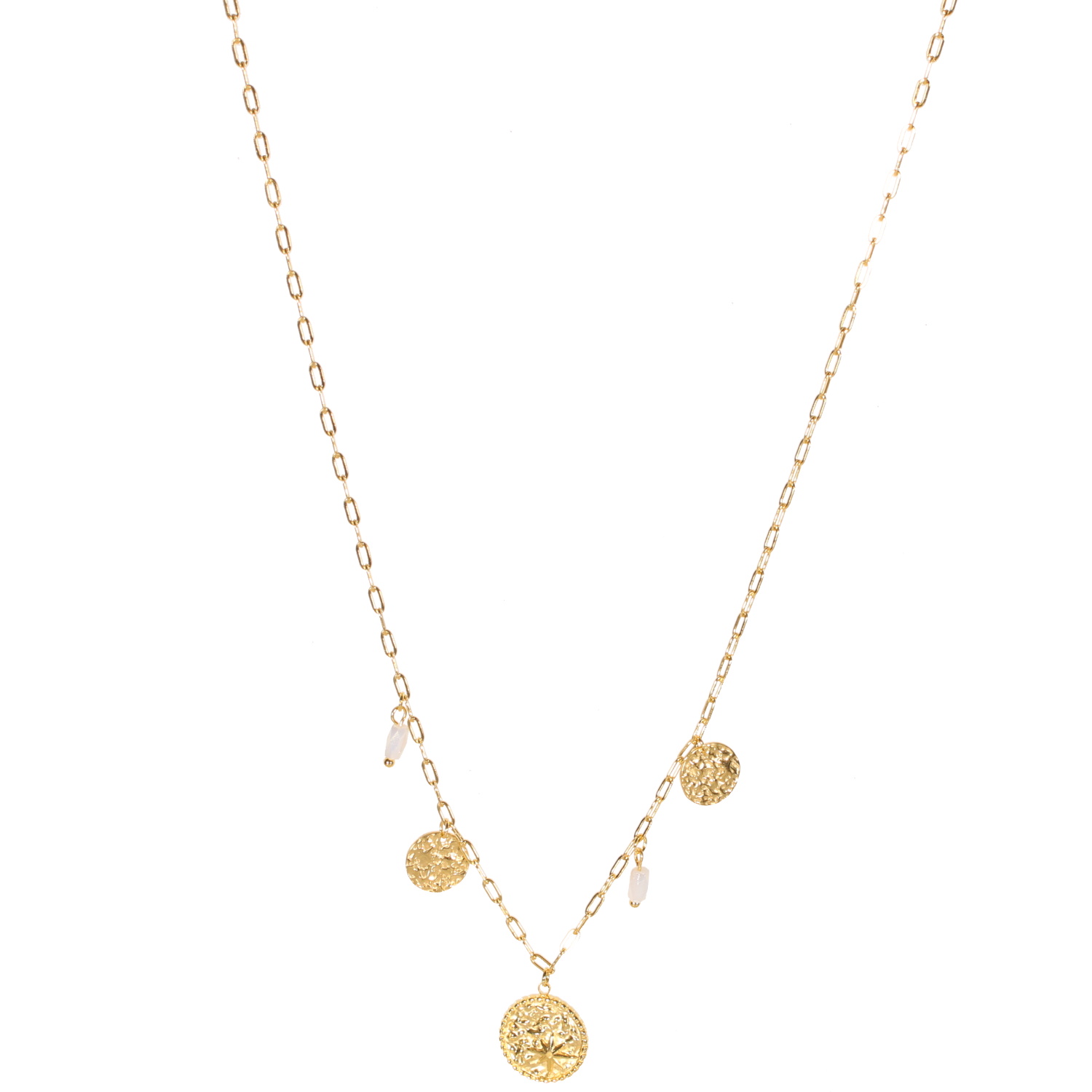 Description Collier avec trois pastilles rondes pendantes martelées et une avec le motif d'étoile en acier doré et deux pierres de couleur blanche. Fermoir mousqueton avec 5 cm de rallonge. Longueur 41+5 cm [Guide des tailles] Matière(s) Acier , Rocaille . L'acier utilisé dans la bijouterie existe sous plusieurs qualités. Nous utilisons principalement la qualité 316L, qualité qui est utilisée en chirurgie. Cet acier est donc inoxydable et reste très résistant. Fermoir Mousqueton À noter Pendentifs 10 et 14 mm de diamètre Couleur(s) dominante(s) Blanc , Doré Public Adolescent , Adulte . Genre Femme , Fille . Saison Indémodable . Thème(s) Nature . Collection Reflets Cliquez sur une matière, un thème, une couleur ou une collection pour voir tous les articles associés.
