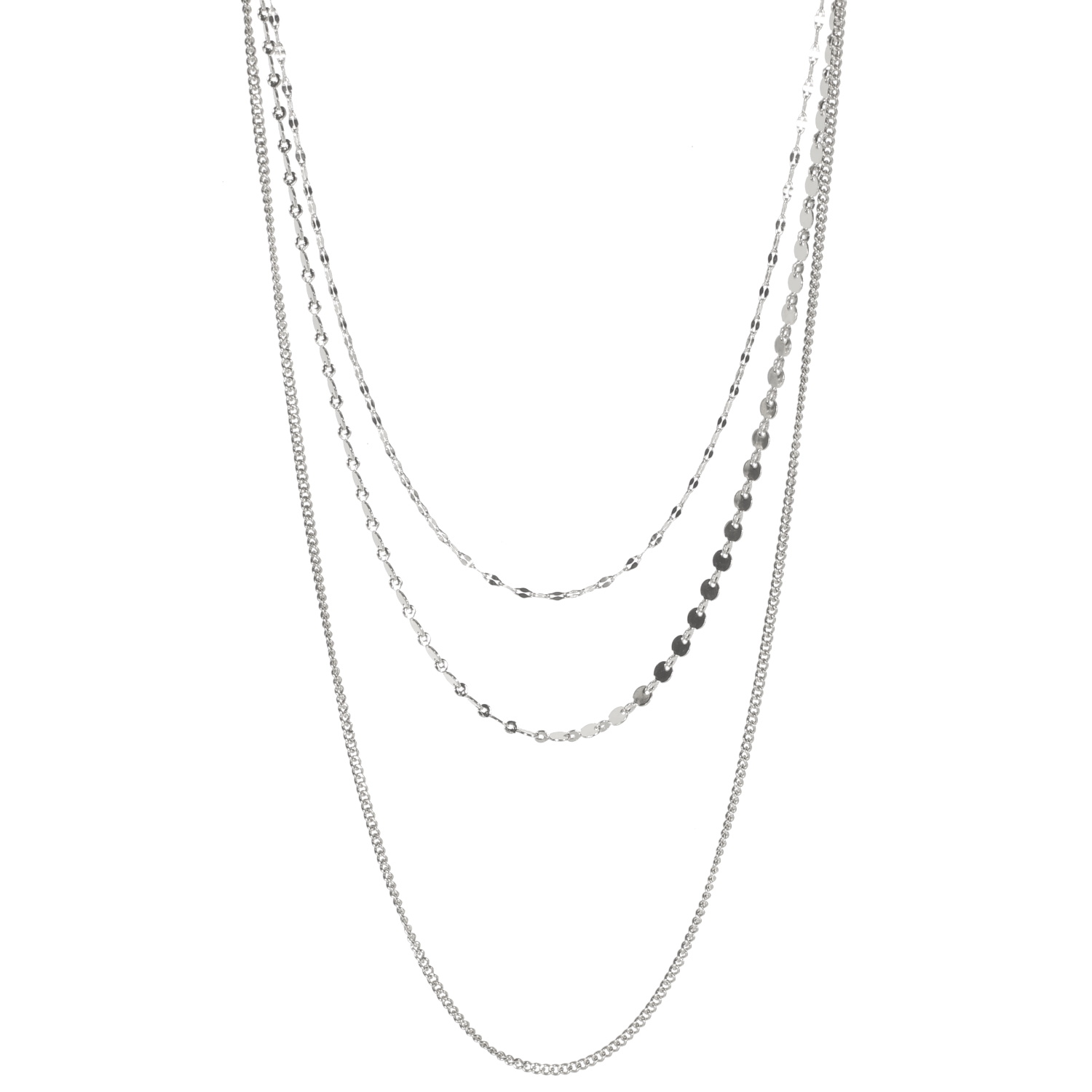 Description Collier triple rangs composé d'une chaîne de 39 cm de long en acier argenté, une chaîne de petites pastilles rondes de 42 cm de long en acier argenté, ainsi qu'une chaîne de 54 cm de long en acier argenté. Fermoir mousqueton avec 7 cm de rallonge. Cliquez sur une matière, un thème, une couleur ou une collection pour voir tous les articles associés.