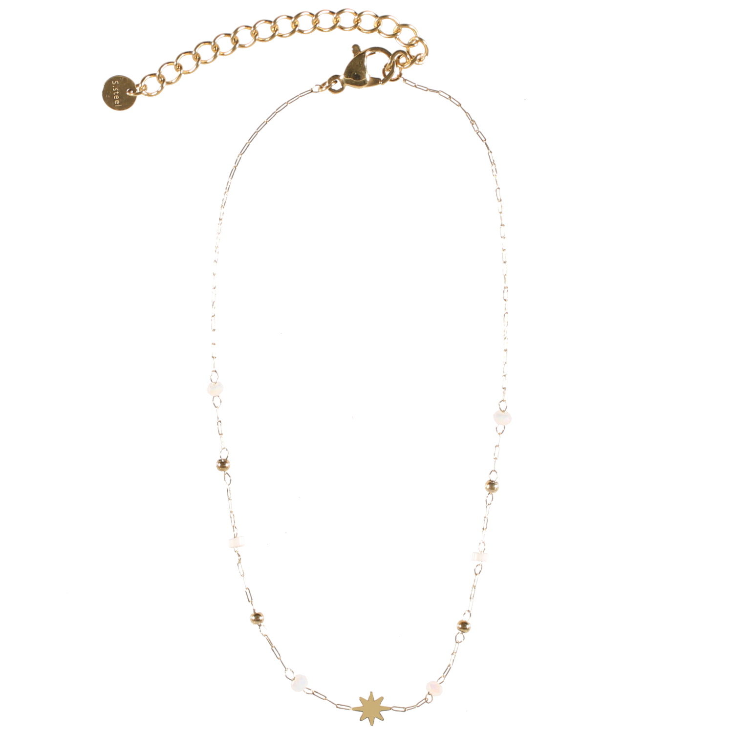 Bracelet chaîne de cheville avec étoile en acier doré surmonté de perles de couleur.