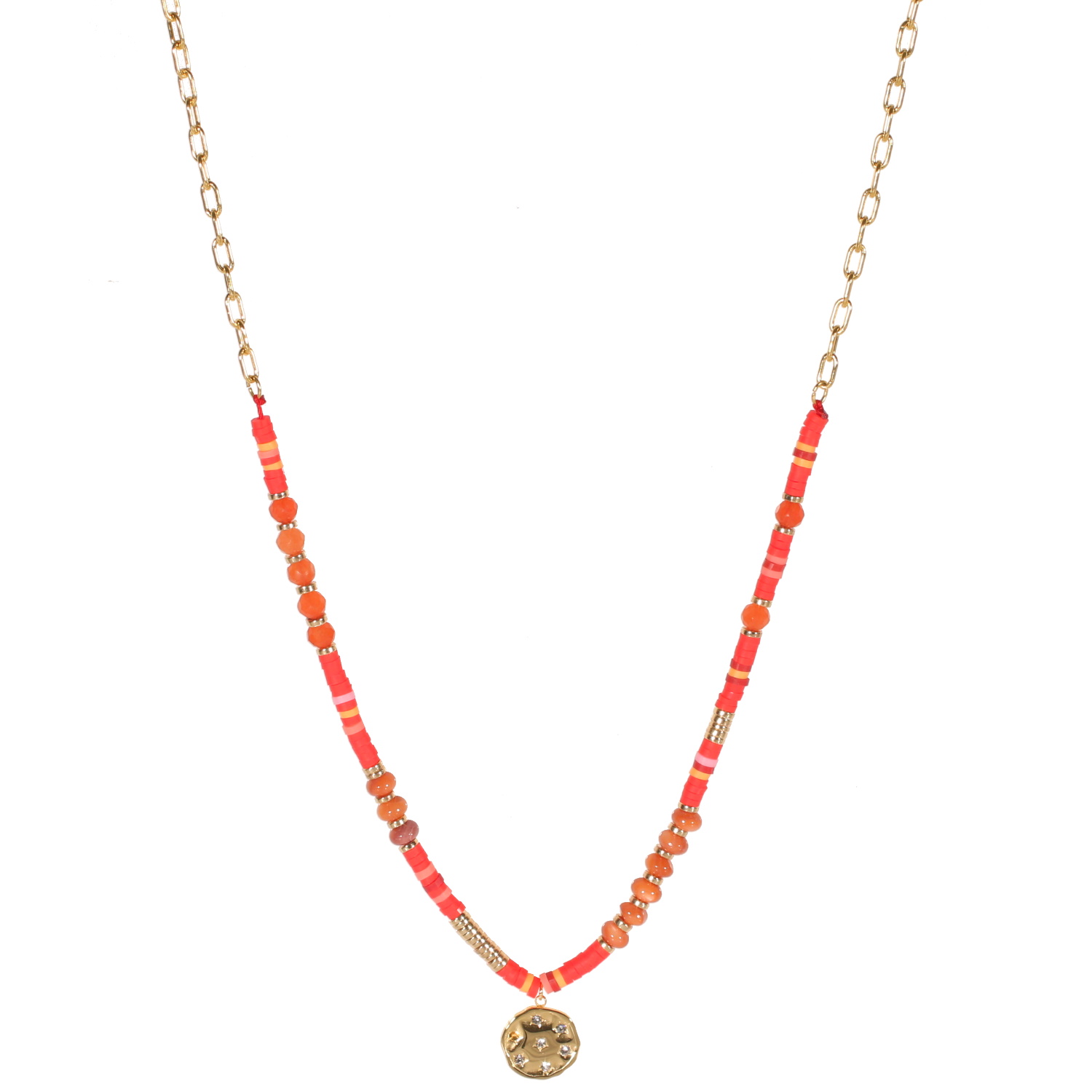 Collier composé d'une chaîne en acier doré et perles cylindriques heishi en résine synthétique et caoutchouc de couleur rouge, ainsi qu'un pendentif rond en acier doré pavé de strass en forme d'étoiles.