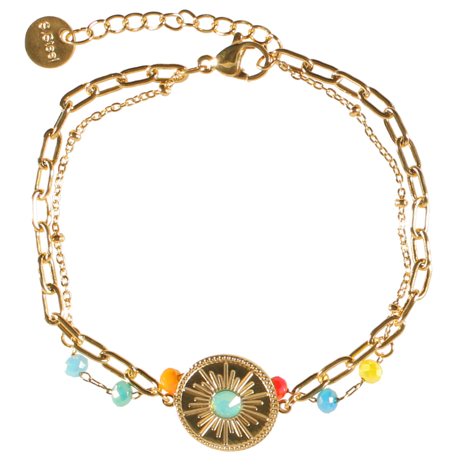 Bracelet double rangs composé d'une chaîne en acier doré avec perles multicolores et d'une chaîne en acier doré avec une pastille ronde aux motifs de rayon surmontée d'un cristal de couleur turquoise.