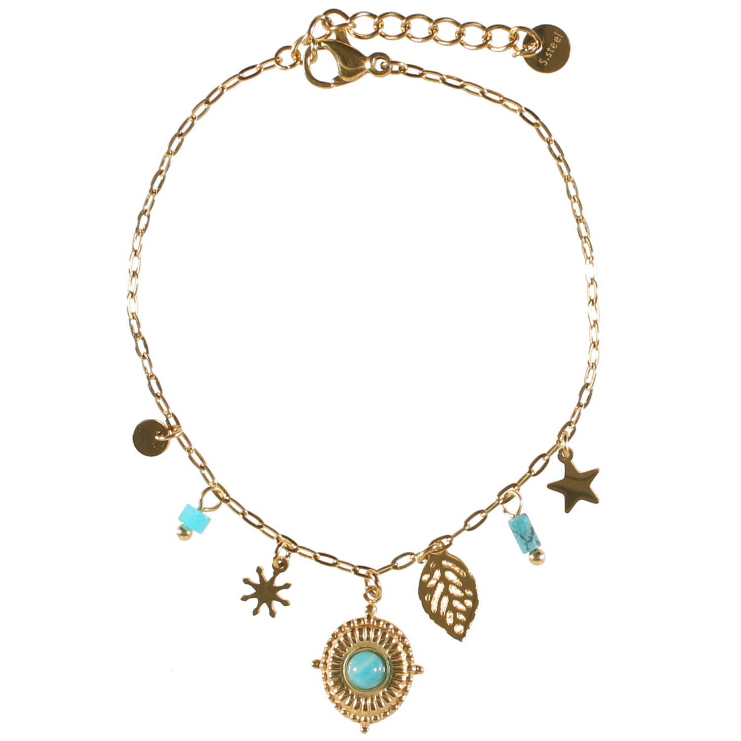 Bracelet composé d'une chaîne avec pendants feuille et étoiles en acier doré, des pampilles perles en véritable pierre d'amazonite, ainsi qu'une pastille pendante ovale en acier doré surmonté d'une véritable pierre d'amazonite.