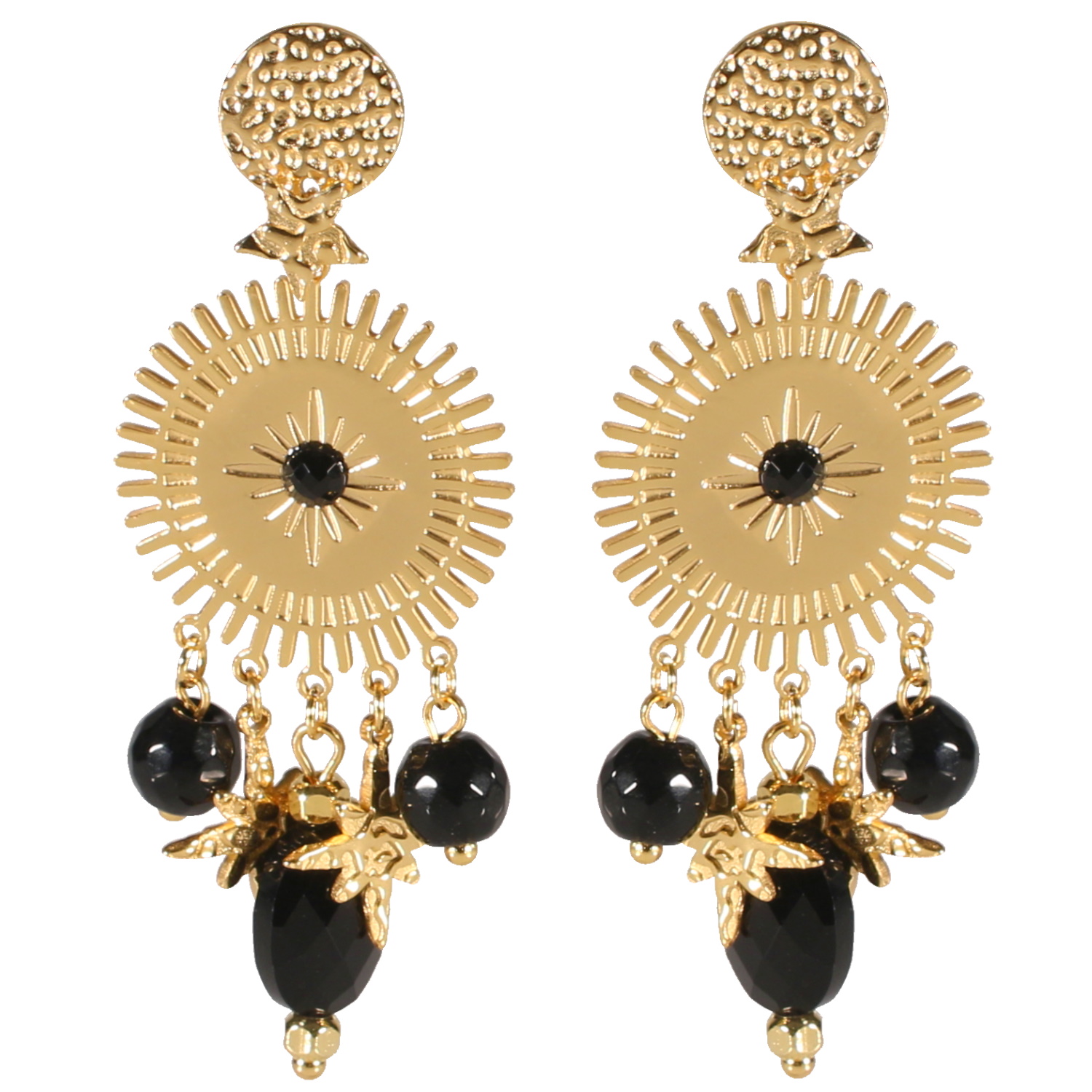 Description Boucles d'oreilles pendantes composées d'une puce ronde martelée, d'une étoile et d'une pastille ronde au contour en forme de rayons en acier doré avec gravure d'étoile incrustée d'un cristal de couleur noire, ainsi que de pampilles en forme d'étoile en acier doré et de perles de couleur noire. Largeur 23 mm Hauteur 58 mm Matière(s) Acier , Rocaille . L'acier utilisé dans la bijouterie existe sous plusieurs qualités. Nous utilisons principalement la qualité 316L, qualité qui est utilisée en chirurgie. Cet acier est donc inoxydable et reste très résistant. Fermoir Tiges poussettes Couleur(s) dominante(s) Doré , Noir Public Adolescent , Adulte . Genre Femme , Fille . Saison Indémodable . Thème(s) Nature . Cliquez sur une matière, un thème, une couleur ou une collection pour voir tous les articles associés.