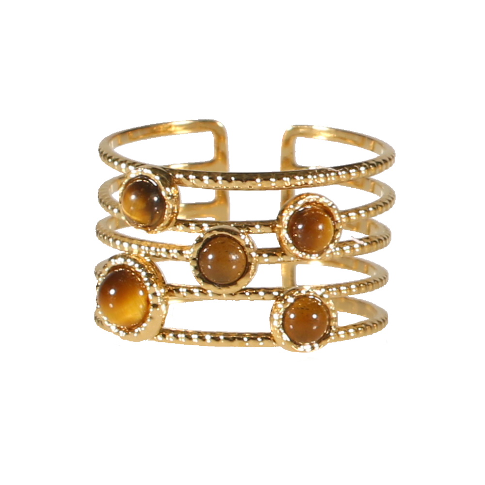 Bague composée de 5 rangs en acier doré surmontée de 5 véritables pierres d'œil de tigre serties clos.