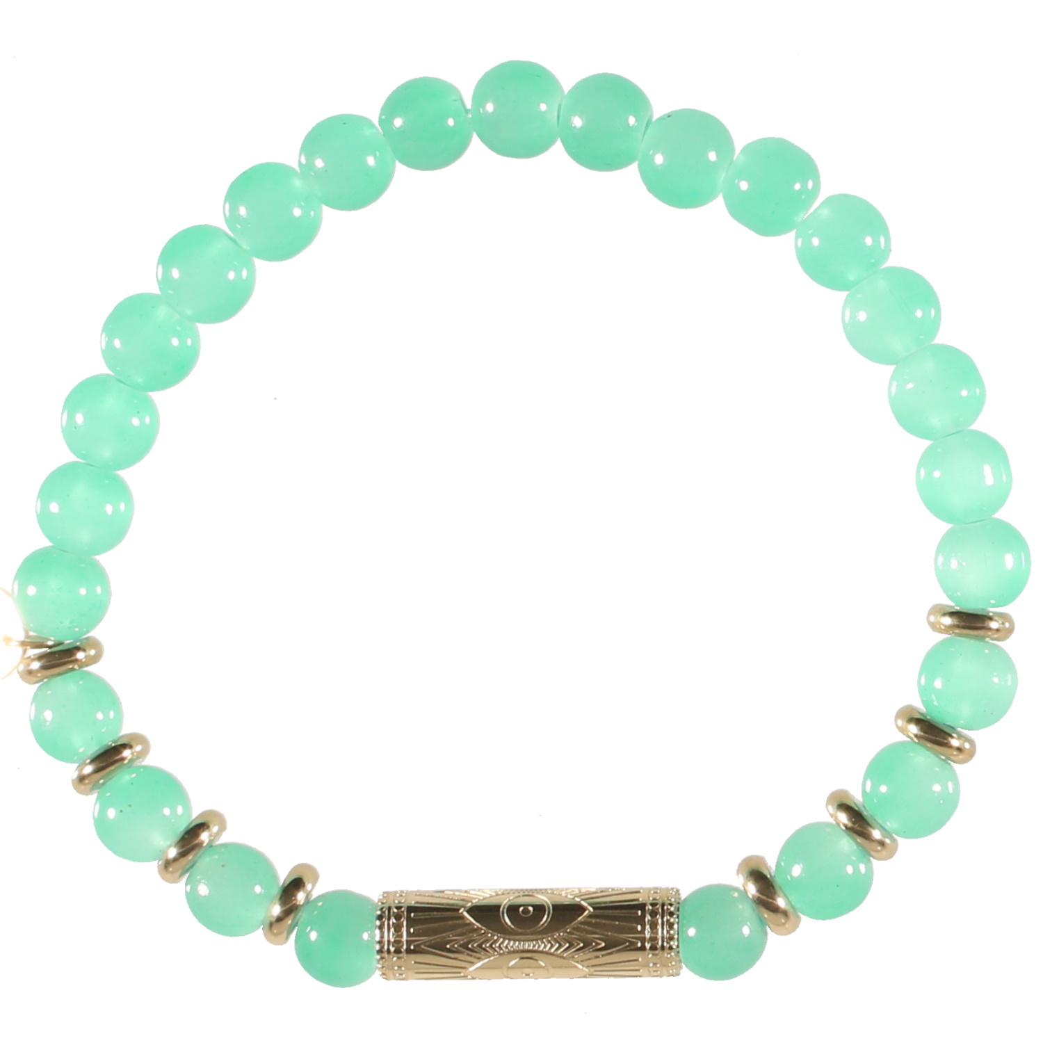 Bracelet élastique composé de perles cylindriques et un tube cylindrique en acier doré avec motifs d'œil de Turquie, ainsi que des perles de couleur verte.