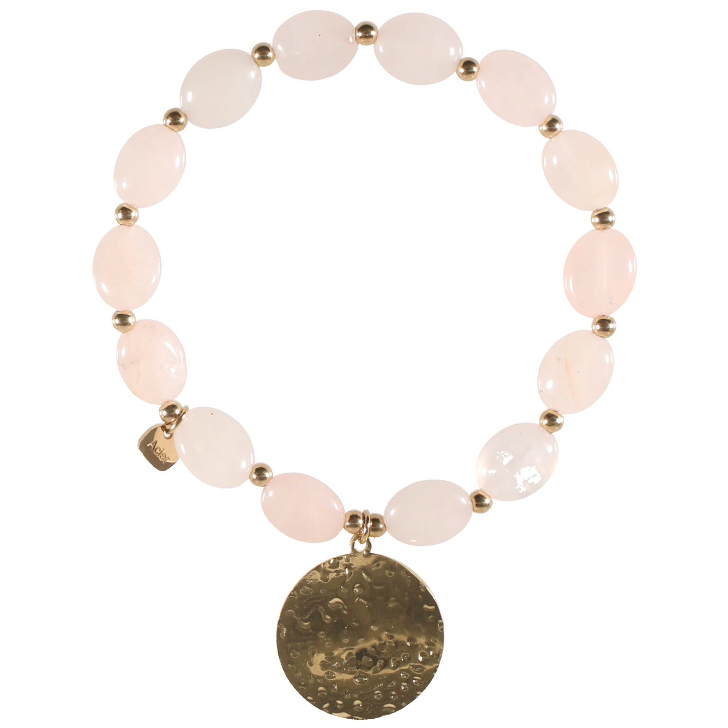 Bracelet élastique composé de perles en acier doré, des perles en véritable pierre de quartz rose et d'une pastille ronde martelée en acier doré.