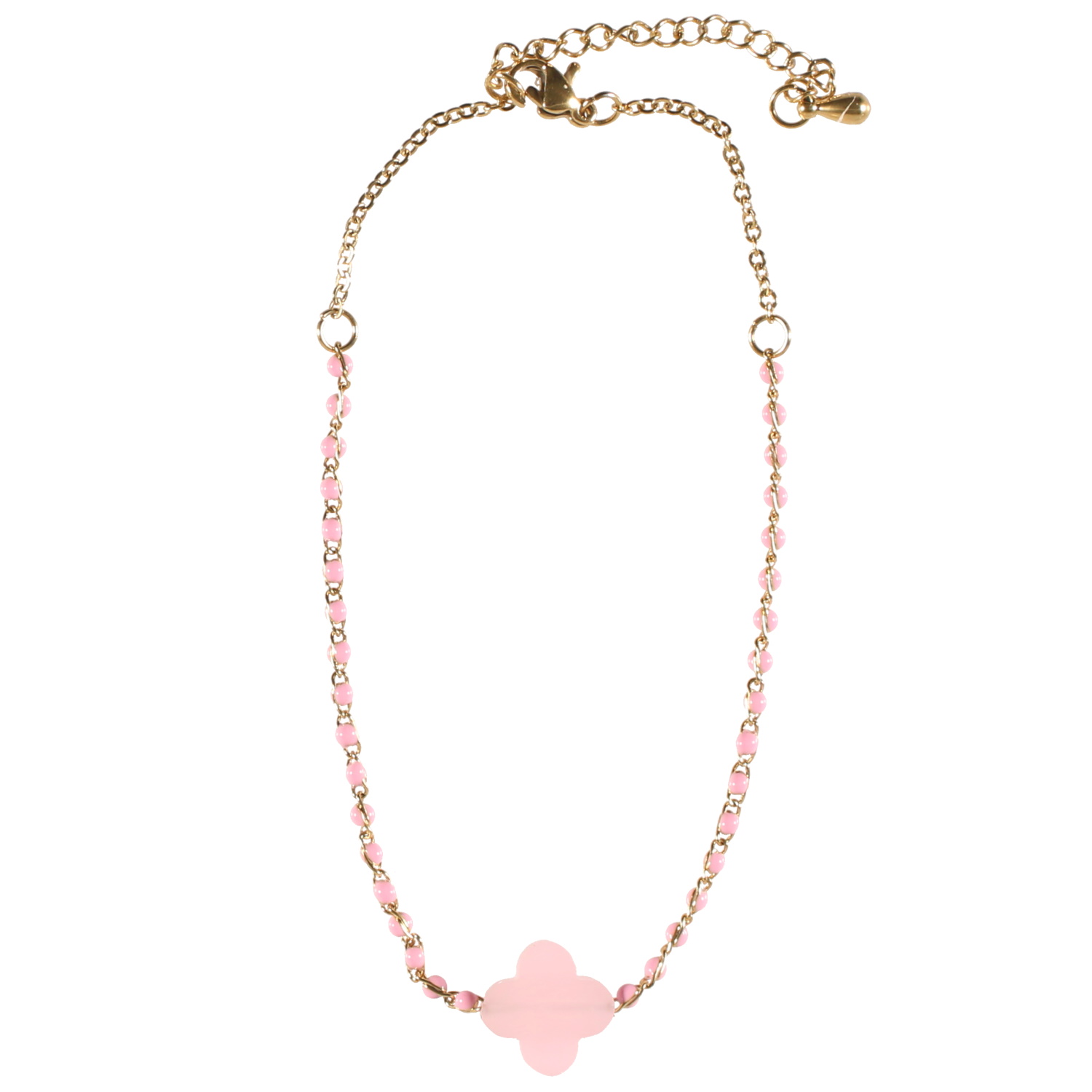 Bracelet chaîne de cheville composé d'une chaîne en acier doré, de perles en émail de couleur rose et un trèfle à quatre feuilles en pierre synthétique de couleur rose.