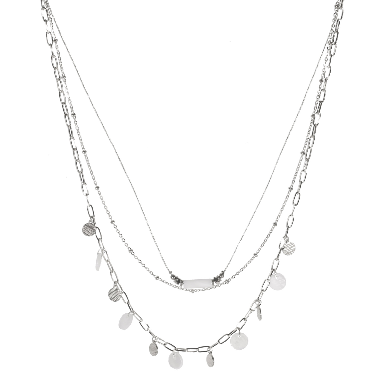 Collier triple rangs composé d'un collier de 40 cm de long en acier argenté surmonté d'un tube de nacre, d'une chaîne de 42 cm de long en acier argenté et d'une chaîne de 47 cm de long avec pampilles rondes rayées en acier argenté et des pampilles de nacre.<br/>Fermoir mousqueton avec 5 cm de rallonge. Multirangs Rond  Adolescent Adulte Femme Fille Indémodable Collier triple rangs composé d'un collier de 40 cm de long en acier argenté surmonté d'un tube de nacre, d'une chaîne de 42 cm de long en acier argenté et d'une chaîne de 47 cm de long avec pampilles rondes rayées en acier argenté et des pampilles de nacre.<br/>Fermoir mousqueton avec 5 cm de rallonge. Multirangs Rond  Adolescent Adulte Femme Fille Indémodable