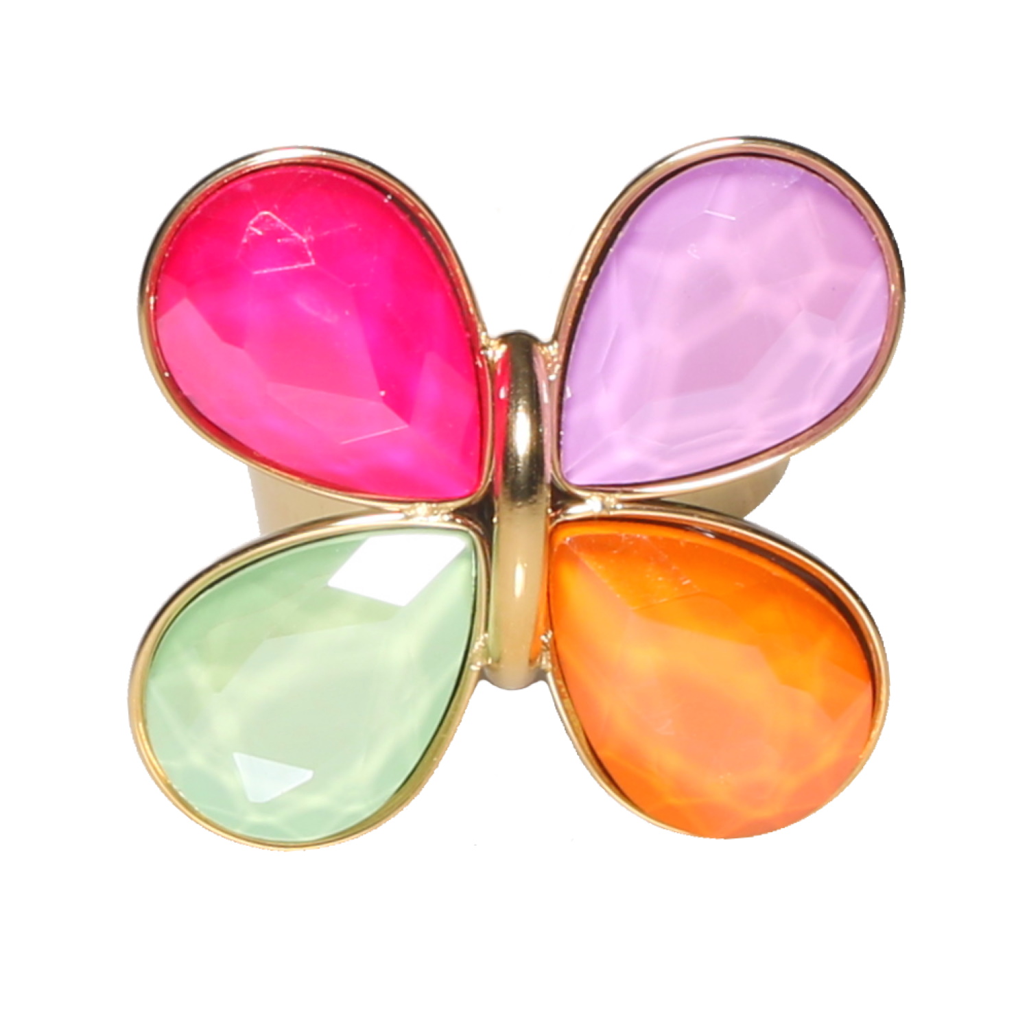 Bague en forme de papillon en acier doré sertie de cristaux multicolores.