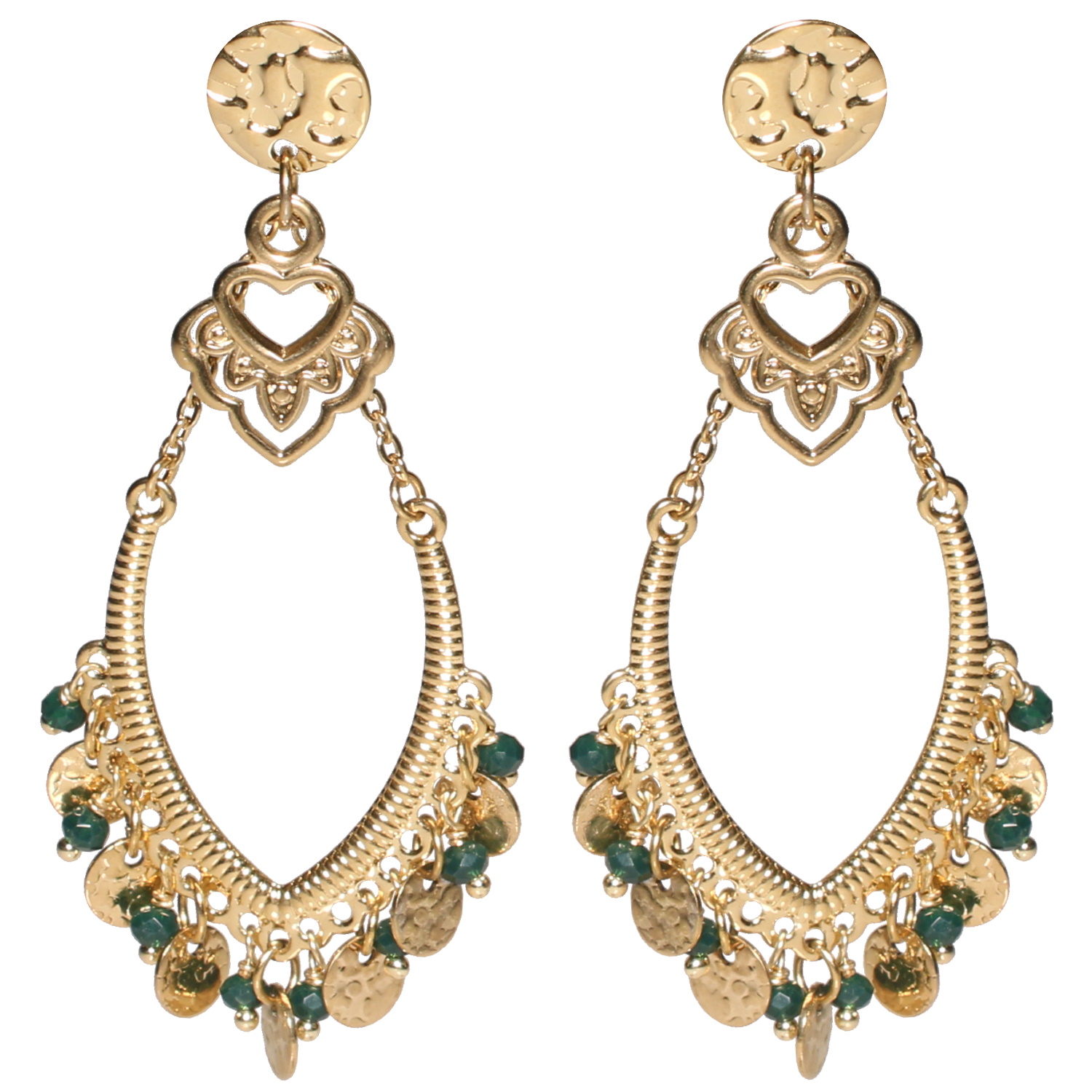 Description Boucles d'oreilles pendantes composées d'une puce ronde martelée, d'un pendant en forme de cœur et de fleur en acier doré et d'un pendant ovale avec des pampilles rondes martelées en acier doré et des pampilles perles vertes. Largeur 30 mm Hauteur 65 mm Matière(s) Acier , Rocaille . L'acier utilisé dans la bijouterie existe sous plusieurs qualités. Nous utilisons principalement la qualité 316L, qualité qui est utilisée en chirurgie. Cet acier est donc inoxydable et reste très résistant. Fermoir Tiges poussettes Couleur(s) dominante(s) Doré , Vert Public Adolescent , Adulte . Genre Femme , Fille . Saison Indémodable . Thème(s) Amour . Cliquez sur une matière, un thème, une couleur ou une collection pour voir tous les articles associés.