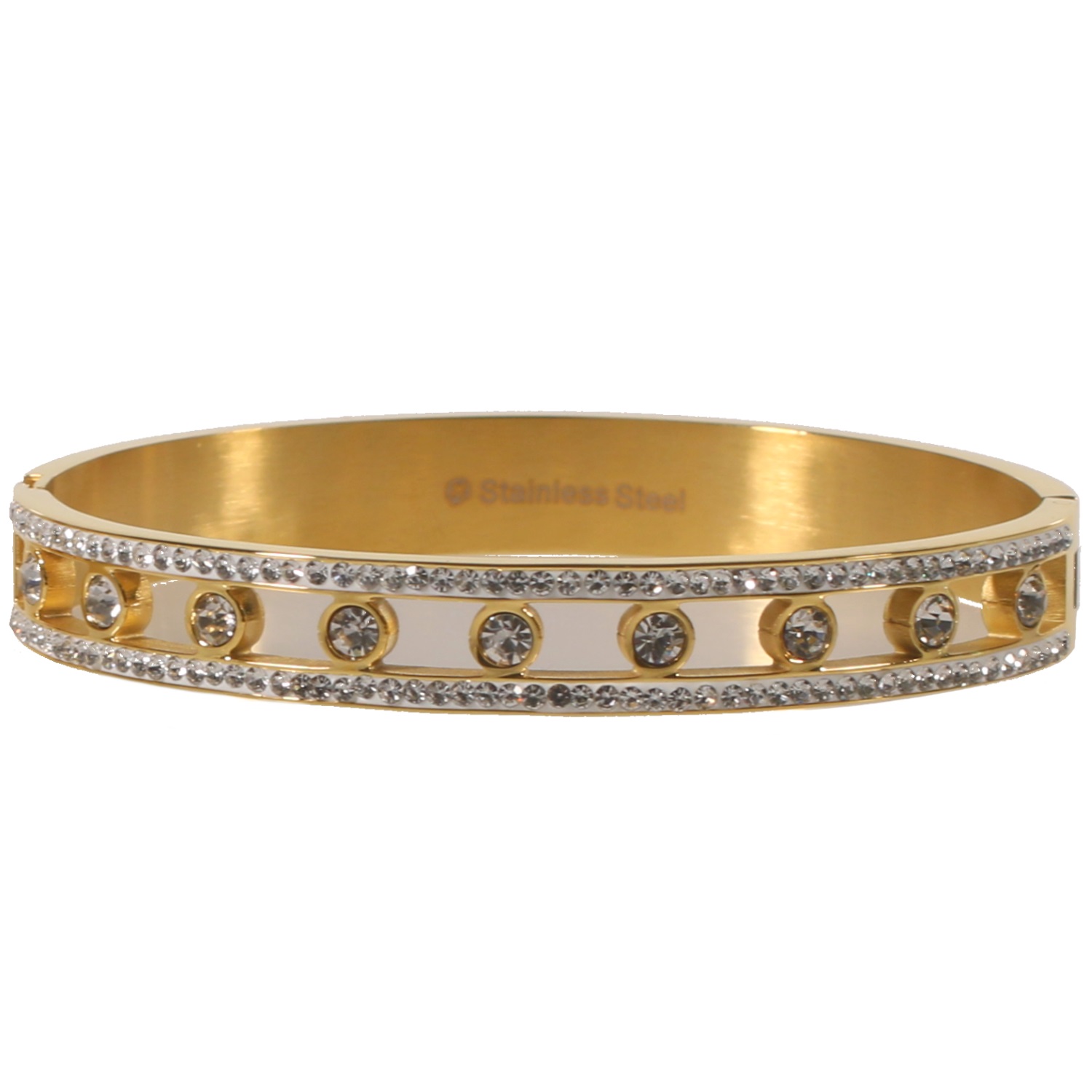 Description Bracelet jonc rigide en acier et cristaux synthétiques. Largeur 9 mm Diamètre 60 mm [Guide des tailles] Matière(s) Acier , Verre . L'acier utilisé dans la bijouterie existe sous plusieurs qualités. Nous utilisons principalement la qualité 316L, qualité qui est utilisée en chirurgie. Cet acier est donc inoxydable et reste très résistant. Fermoir Charnière Couleur(s) dominante(s) Doré Public Adolescent , Adulte . Genre Femme , Fille . Saison Indémodable . Cliquez sur une matière, un thème, une couleur ou une collection pour voir tous les articles associés.