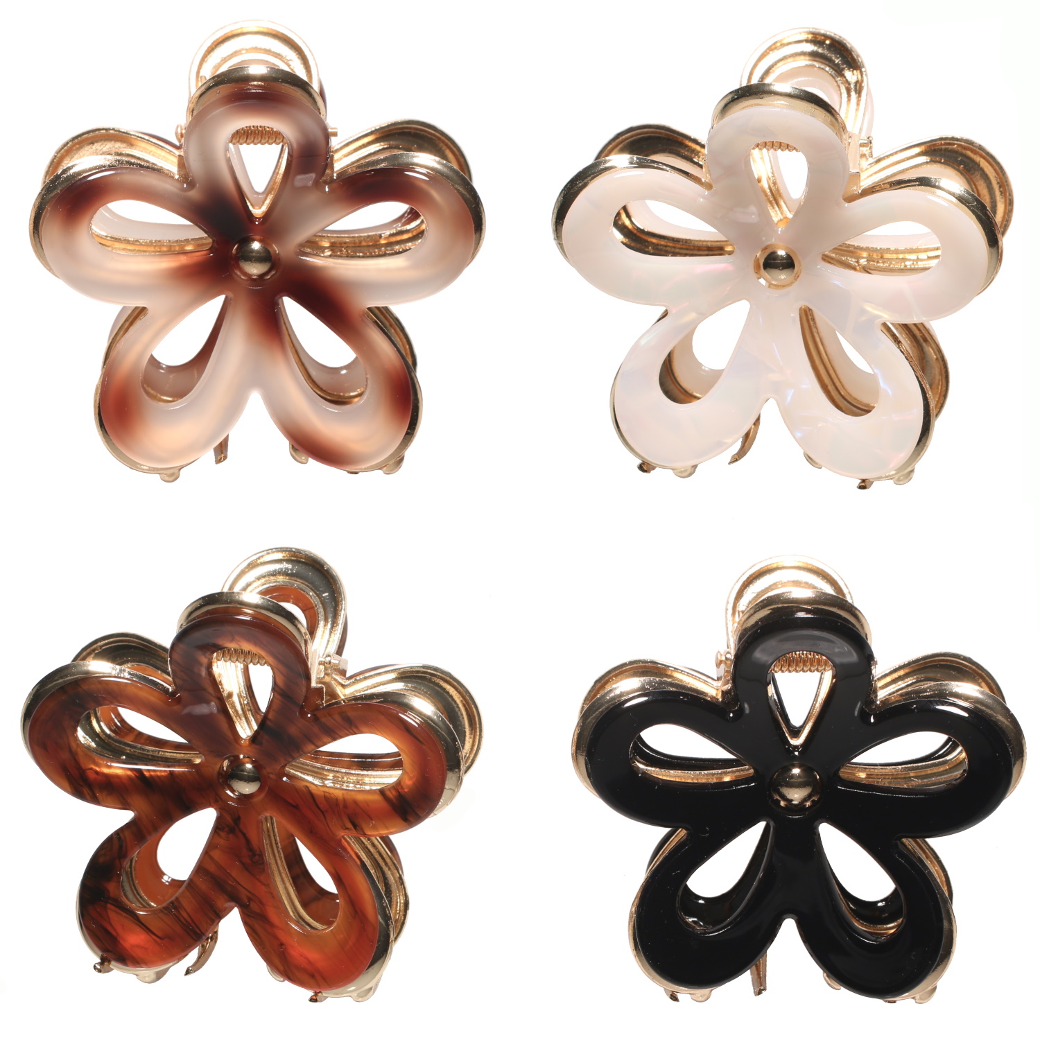 Pince crabe en forme de fleur en en métal doré recouvert de plastique de couleur nacré.