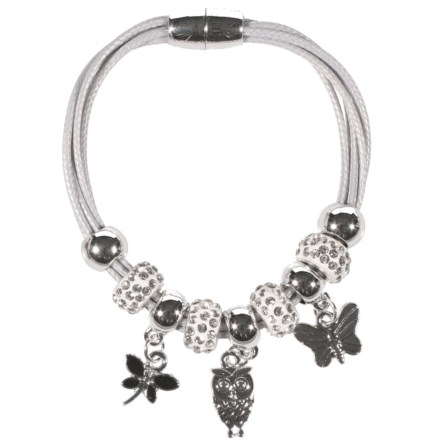Bracelet fantaisie en métal argenté, coton, émail et cristaux synthétiques.