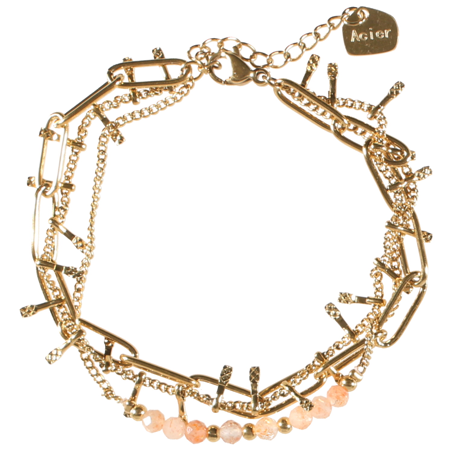 Bracelet triple rangs composé d'une chaîne en acier doré, une chaîne avec pampilles en acier doré et une chaîne en acier doré avec de véritables pierres naturelles.<br/>Fermoir mousqueton avec 3 cm de rallonge. Multirangs Perle  Adolescent Adulte Femme Fille Indémodable