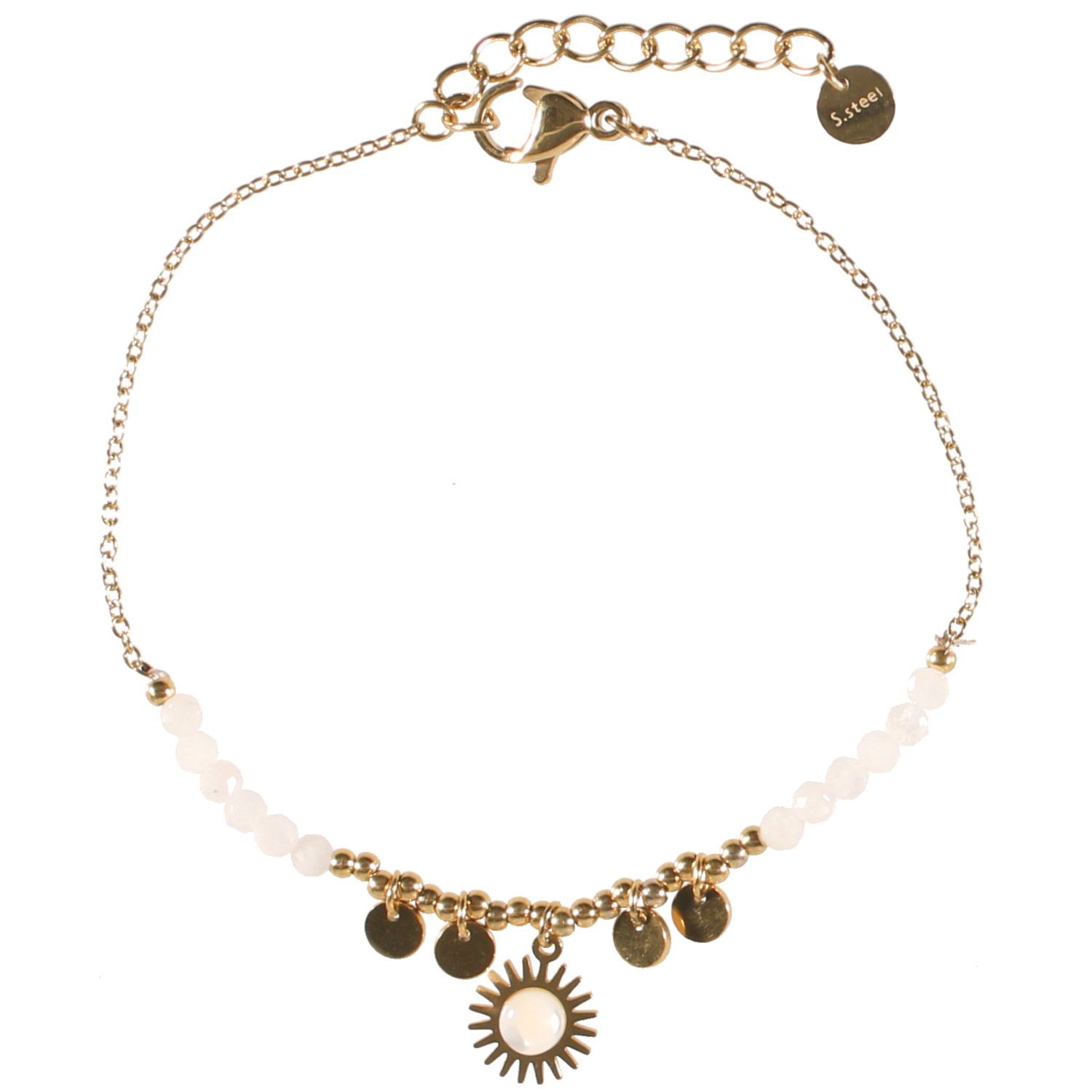 Description Bracelet composé d'une chaîne avec pampilles rondes et perles en acier doré, perles en pierres naturelles de couleur blanche et un pendant soleil en acier doré surmonté d'une pierre naturelle de couleur blanche. Fermoir mousqueton avec 2.5 cm de rallonge. Cliquez sur une matière, un thème, une couleur ou une collection pour voir tous les articles associés.