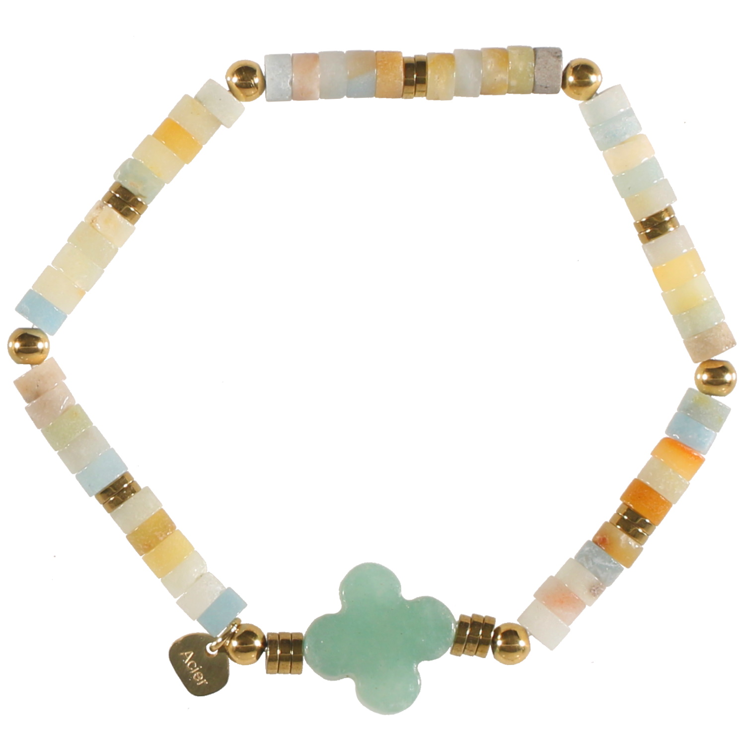 Bracelet élastique composé de perles en acier doré et de perles et d'une pierre en forme de trèfle à quatre feuilles en véritable pierre d'amazonite. Elastique Perle  Adolescent Adulte Eté Femme Fille Printemps