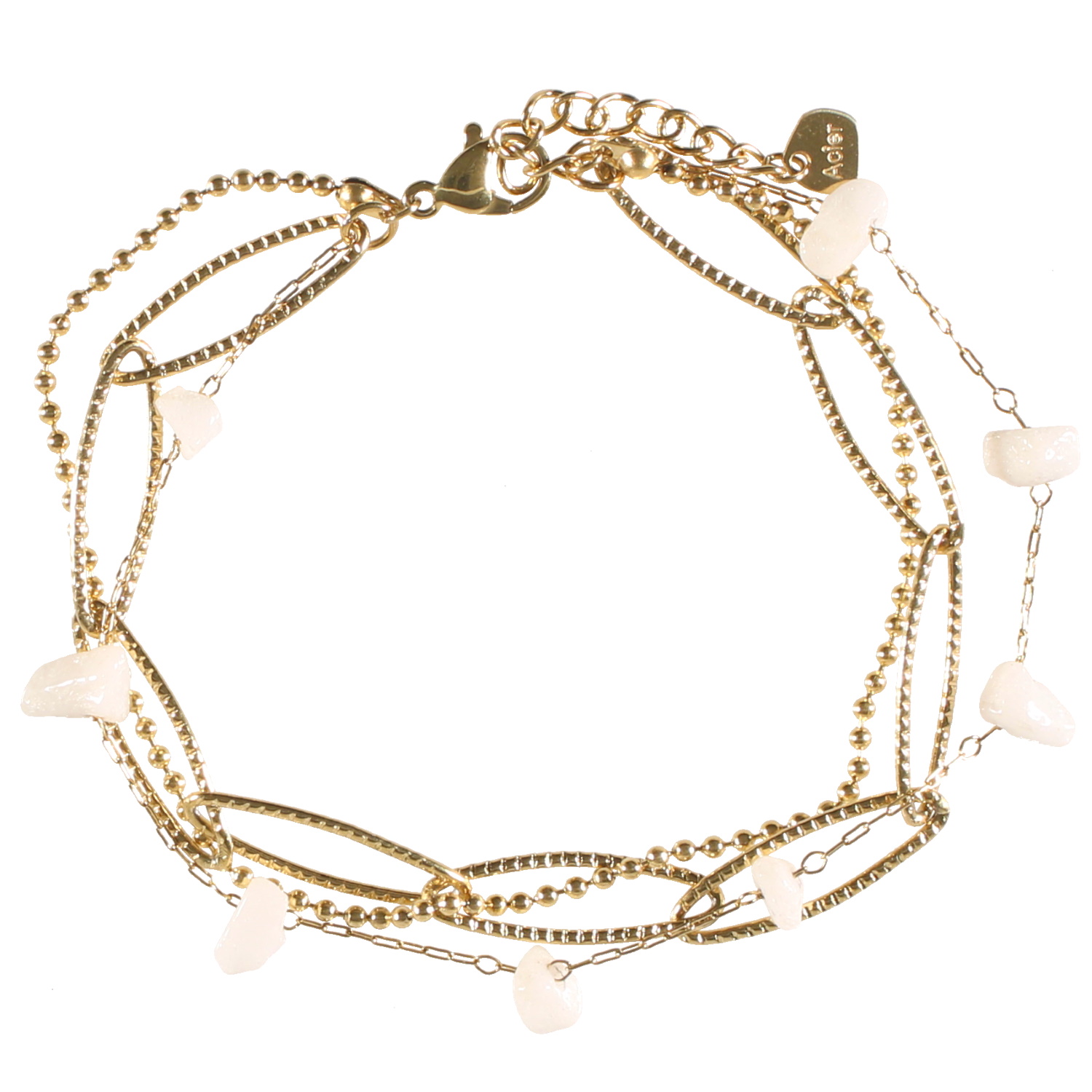 Bracelet triple rangs composé d'une chaîne en acier doré, une chaîne boules en acier doré, ainsi qu'une chaîne en acier doré surmontée de perles en véritable pierre de jade blanc.