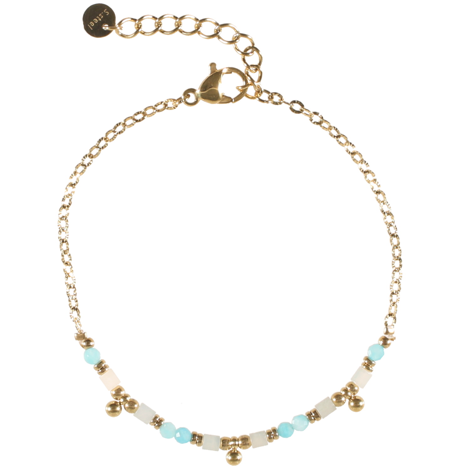 Description Bracelet composé d'une chaîne avec perles en acier doré et de perles rondes et cylindriques en véritable pierre d'amazonite. Fermoir mousqueton avec 3 cm de rallonge. Cliquez sur une matière, un thème, une couleur ou une collection pour voir tous les articles associés.